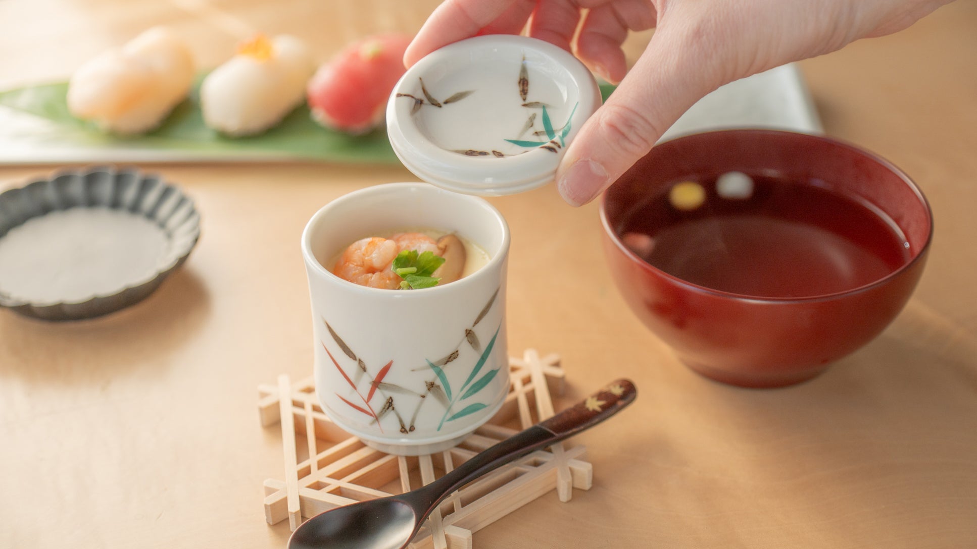 An authentic chawanmushi bowl is tall and narrow in shape, always accompanied by a fitted lid. Its generous depth comfortably holds both the egg mixture and the layered ingredients within. When steaming, the lid plays an essential role, sealing in the aroma and warmth while adding a sense of anticipation, as the hidden ingredients are only revealed once it is lifted.