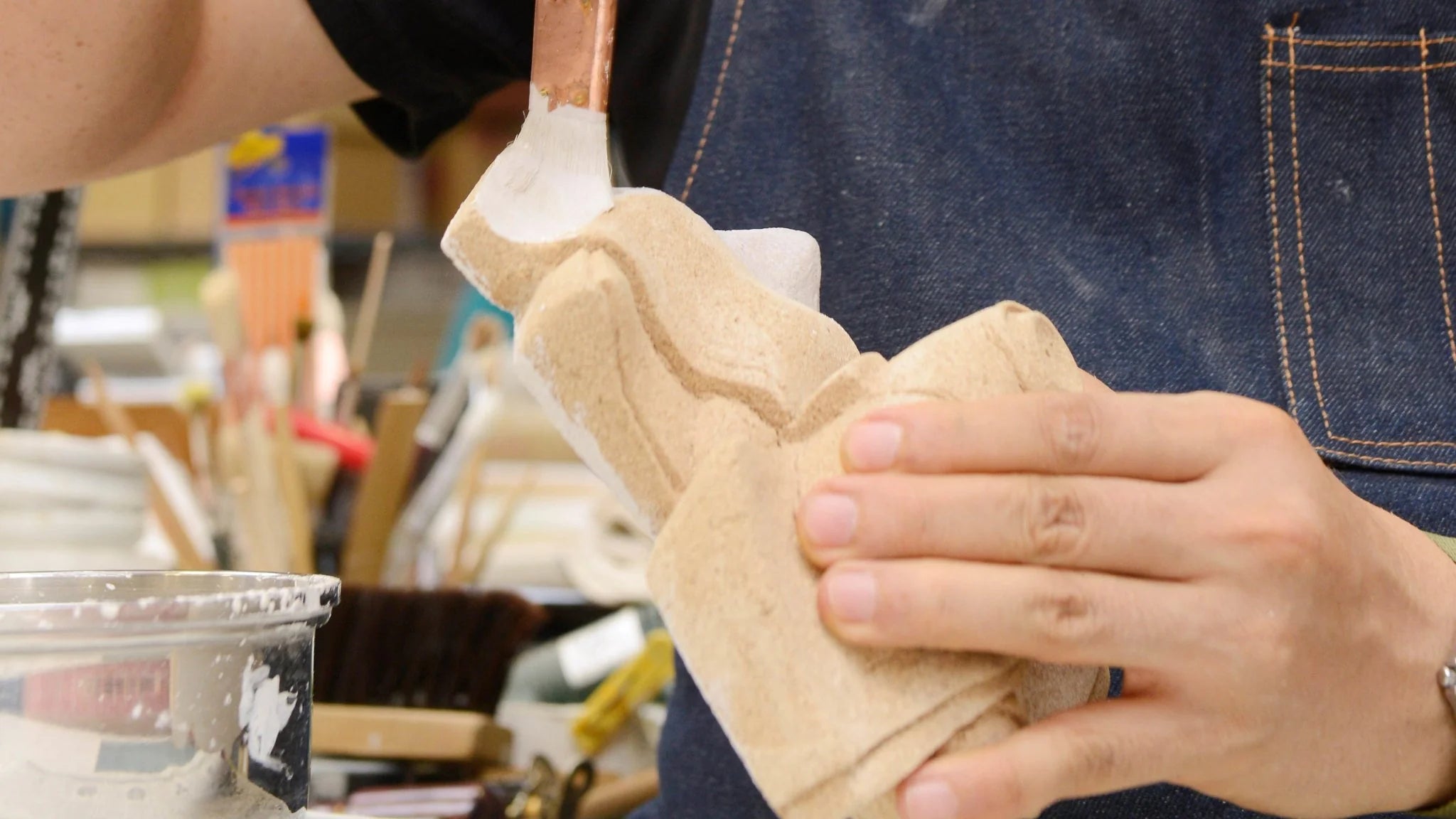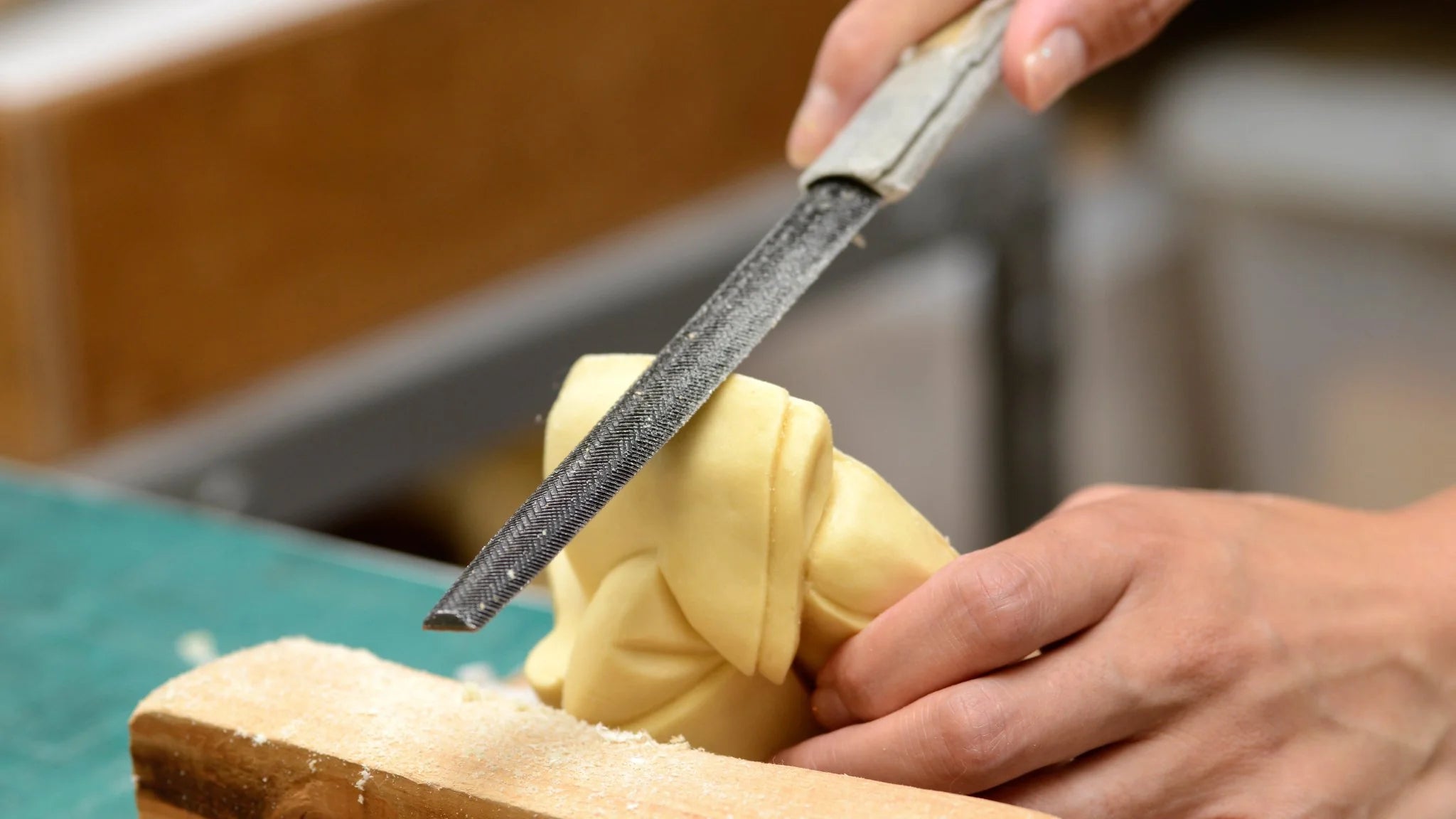 Kimekomi Dolls are modeled using a technique called "Touso," which uses paulownia wood as the core and clay made from paulownia wood flour and glue. While drying, the dolls are carefully deburred and sanded to create a precise shape. In modern times, resin is sometimes used in place of Toso.