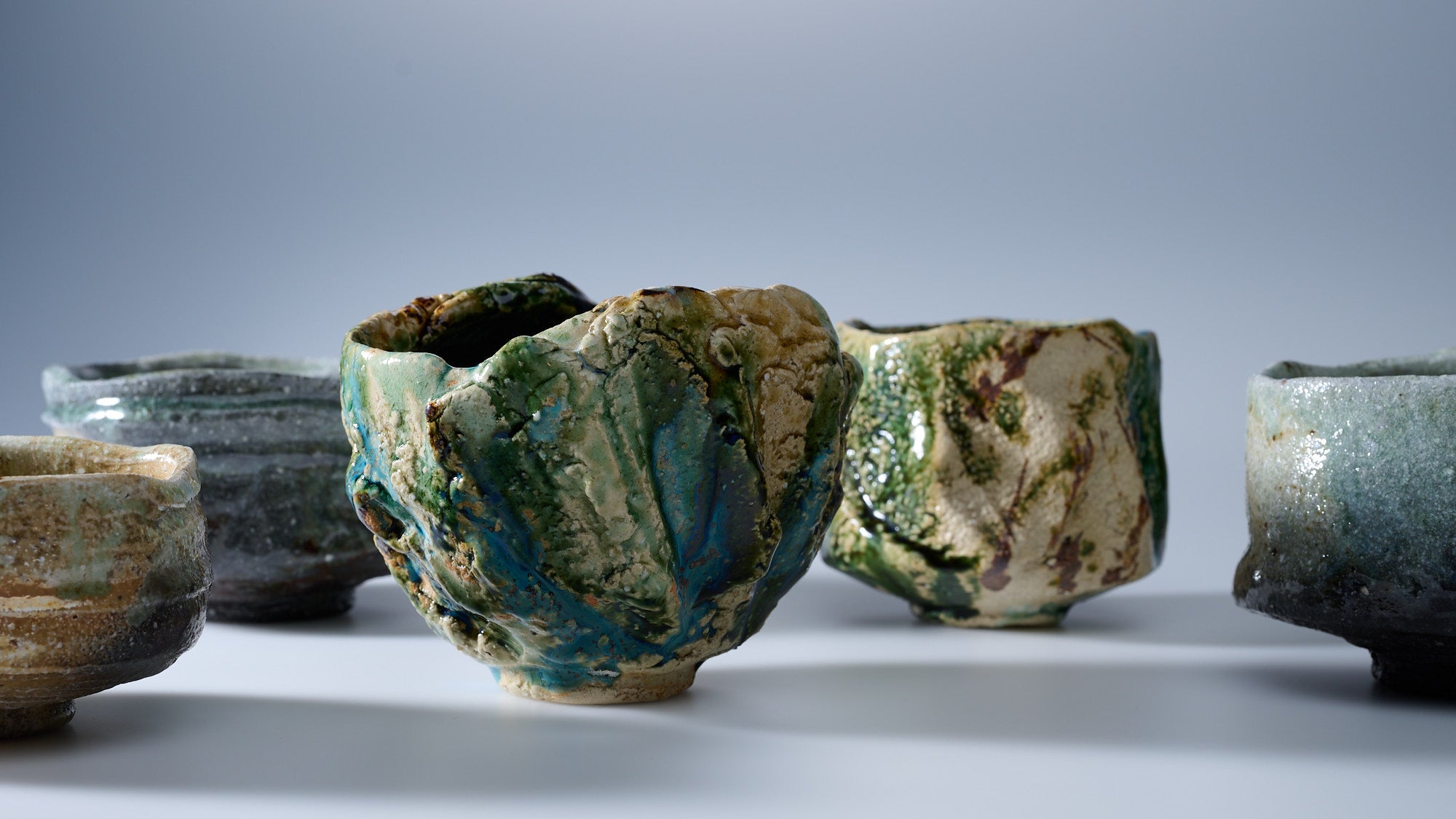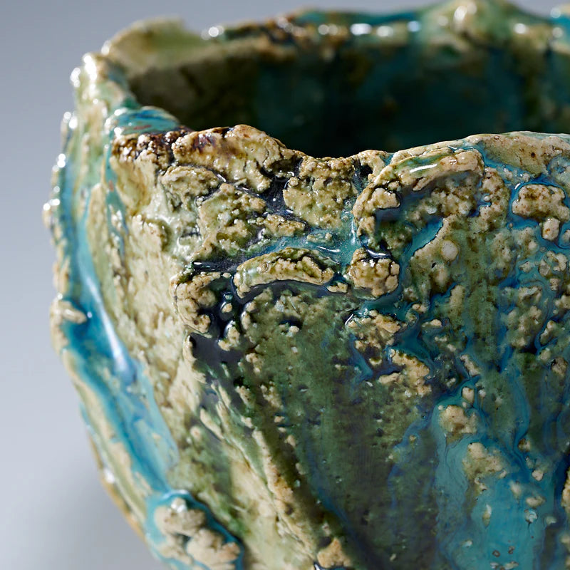 His works reveal this sense of inevitability infused with the vitality of nature. In his Iga-Oribe matcha bowl, the deep green Oribe glaze shimmers with flashes of vivid blue, while the metallic sheen at the base contrasts with organic irregularities shaped by the kairagi texture, rising like cave formations. Each piece captures the strength of clay, the marks of fire, and the passage of time, leaving the viewer with beauty, depth, and a quiet reverence for nature’s power.