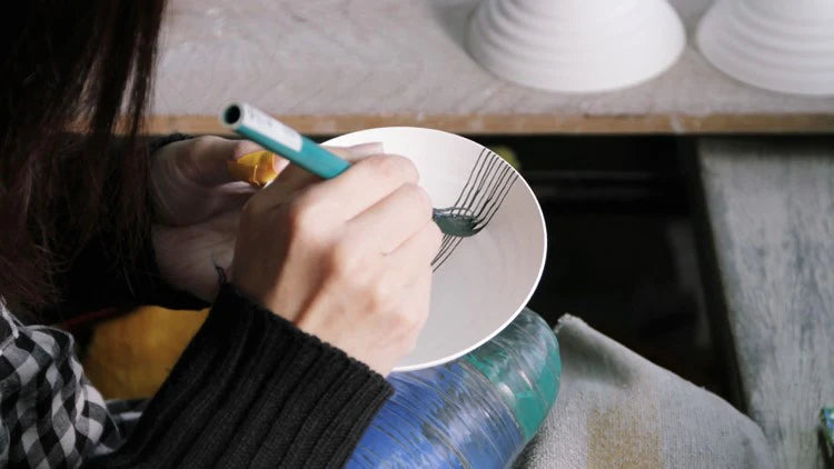Fukuhou Kiln is known for its excellent Tokusa drawing, one of the best in the Hasami ware production area. They use a unique brush with three separate tips, which could draw three lines at once. It takes meticulous skill and focus to draw a thin line vertically both inside and outside of the products.