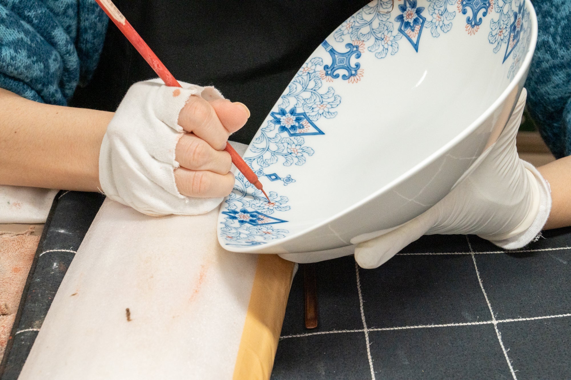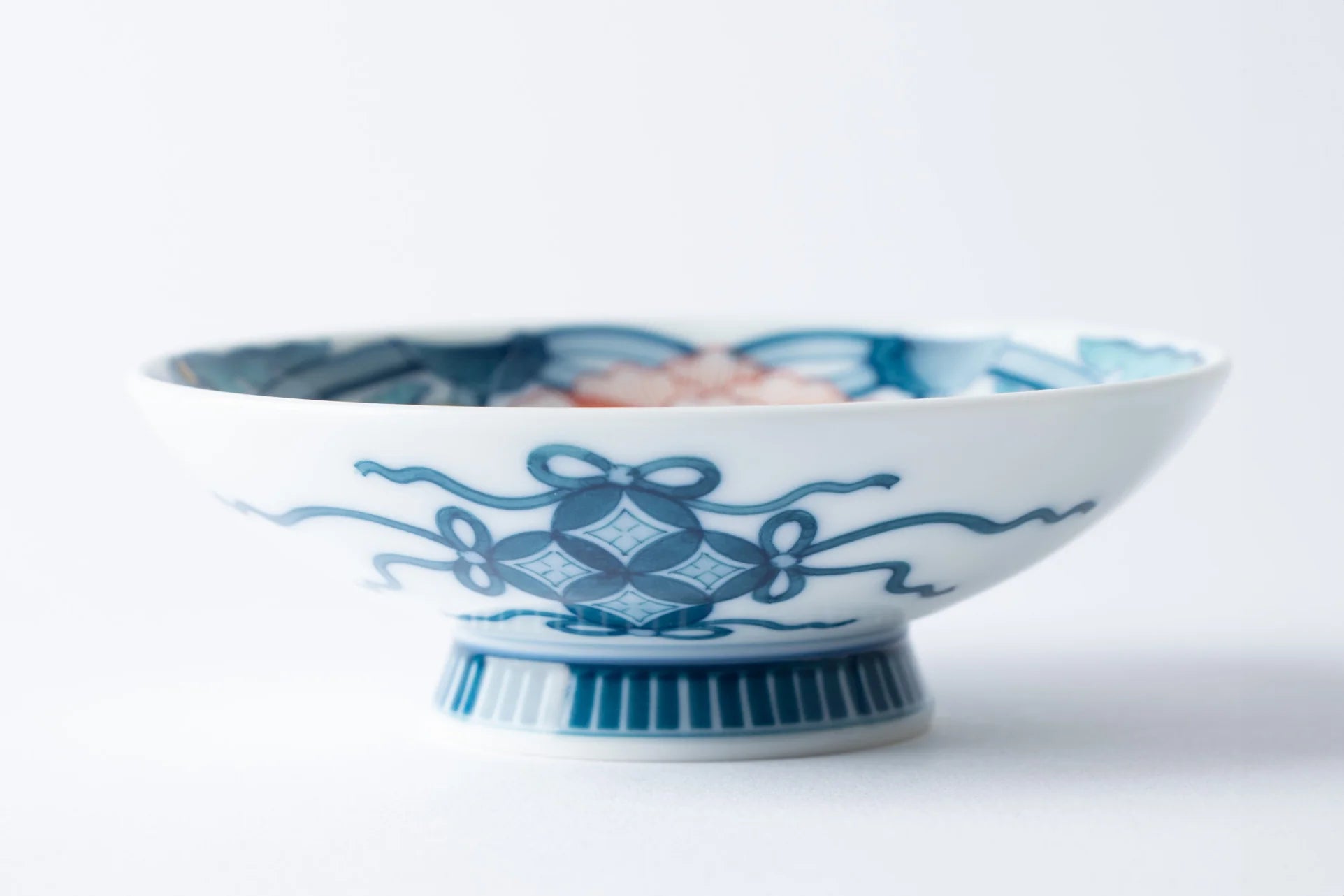 The exquisite craftsmanship of Nabeshima artisans is evident in every aspect of their work. One notable example is the kodai—the elevated foot of the vessel—whose design required evenly spaced patterns resembling the teeth of a comb, executed with absolute precision and without the slightest deviation. The painting was equally meticulous, featuring delicate underglaze lines drawn with gosu, a cobalt-blue pigment prized for its subtle beauty. Naturally, the molding process had to be flawless, allowing no room for distortion or imperfection.