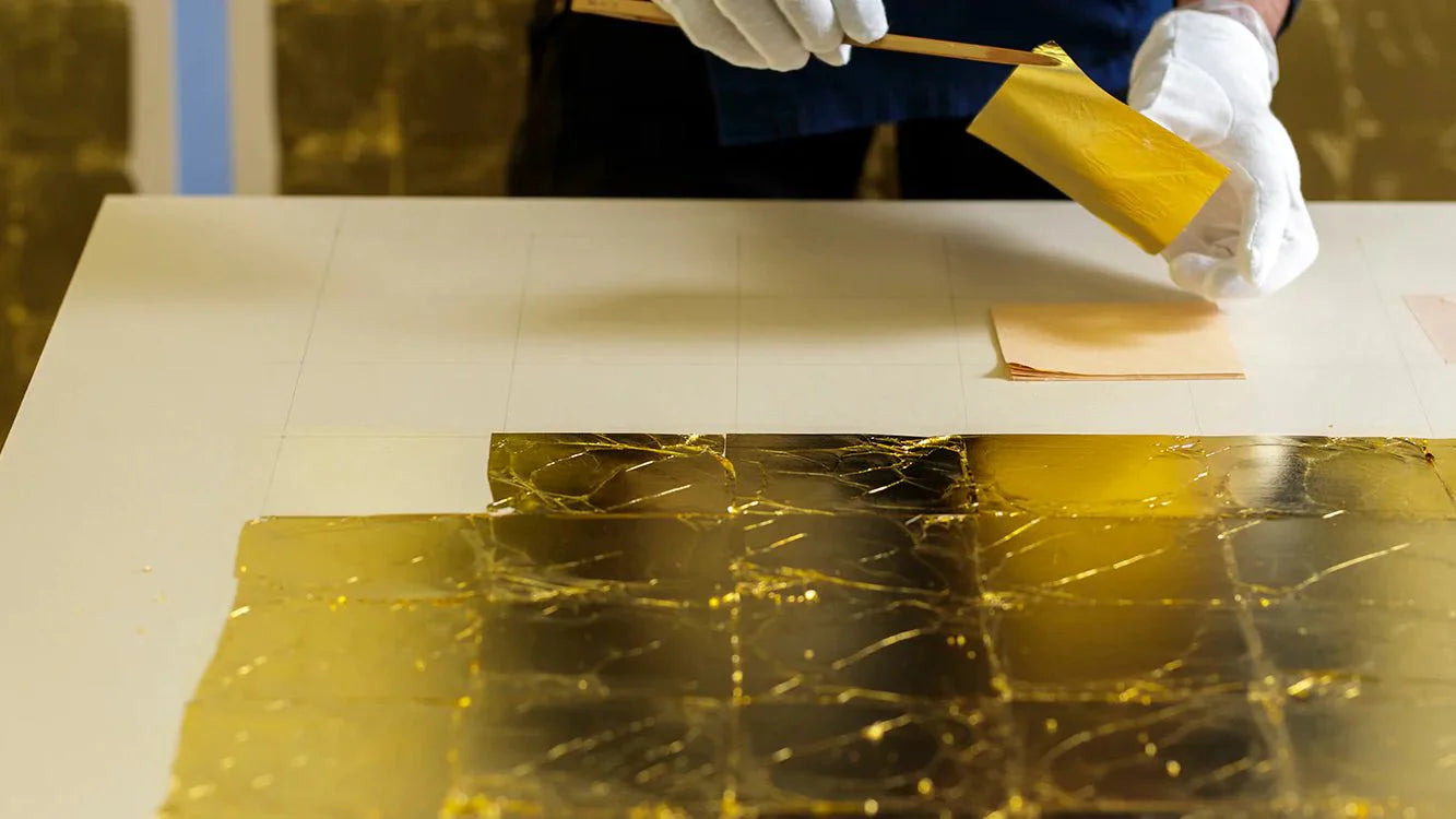 Gold leaf is only about one ten-thousandth of a millimeter thick—so thin that just 2 g (0.07 oz) of gold can be beaten out to cover an area the size of a tatami mat. Many factors must align to produce such an ultra-thin leaf: exceptional craftsmanship, specialized paper that determines the quality of the finished product, favorable climate conditions, and more.