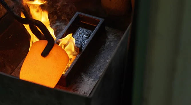 Silver and copper are added because pure gold is too soft to be hammered into leaf. The mixture is heated in a hearth bowl to about 1300℃ (2372℉) and stirred with a carbon rod. After 10–15 minutes, once fully melted, it is poured into molds to solidify.