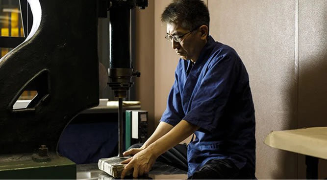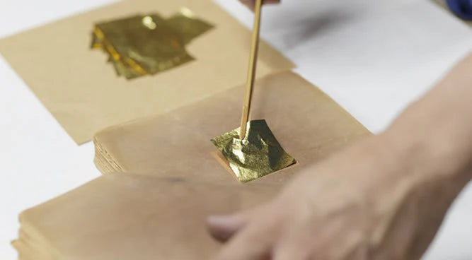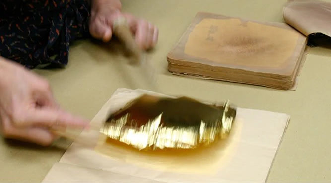 The thin gold leaves, placed between rough pounding papers, are secured with leather and hammered by a metal pounding machine. Once thinned to the desired level, the leaves are transferred to fine pounding paper called omogami and pounded further until they reach about 0.01 mm in thickness.
