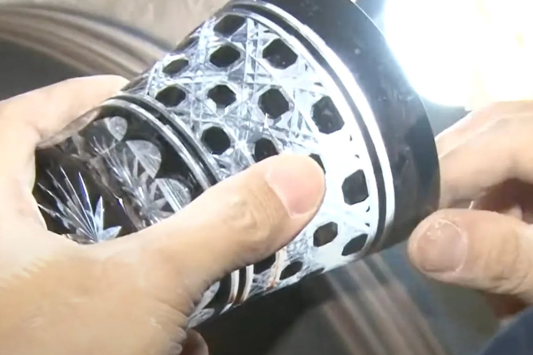 The cutting process involves pressing the glass against a spinning metal wheel to create elaborate designs. Carving patterns along the curved and angled surfaces of the glass requires not only accuracy but also confidence and years of experience to achieve flawless results.