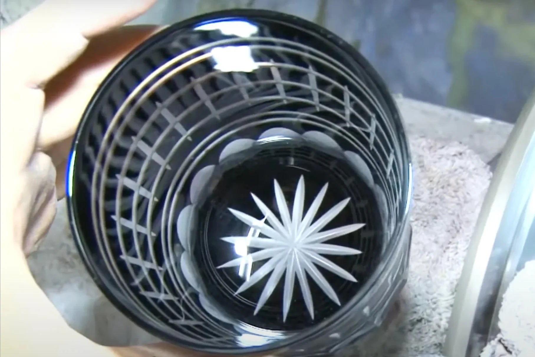 Once a common technique among Edo Kiriko artisans, hand polishing has become increasingly rare due to its delicate and time-consuming nature. The process involves multiple stages, during which the glass is carefully polished using cerium and wooden spinning wheels, as the craftsperson meticulously traces each cut to enhance its shine.