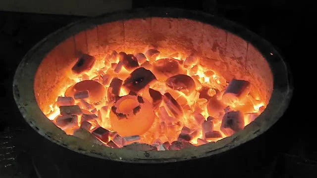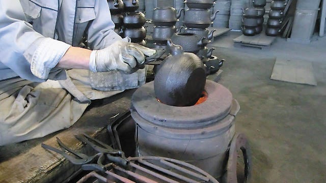 After the casting of ironware has been finished, it is removed from the mold, and the foundry cores are removed and steamed over a charcoal fire at 800°C(1472°F) for about 30-40 minutes to create an oxide film. This is the rust-proofing process unique to Nambu ironware kettle and pot. This process results in a rust-resistant cast iron kettle.
