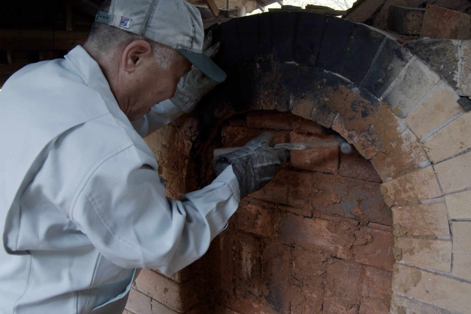 Among the porcelain pieces fired at Le Sanpei Kiln, some are produced using a climbing kiln, or noborigama in Japanese. Typically built on a hill, climbing kilns are made up of several connected firing chambers, each chamber built higher up the slope than the last. The first and lowest chamber is filled with firewood for fuel, and the heat travels up the slope to each successive chamber, resulting in a high-quality firing.