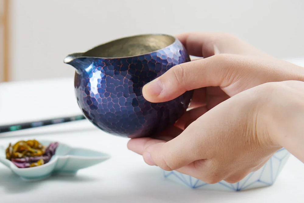 A chirori is a traditional sake carafe typically made from metals such as tin, brass, or copper. This vessel is designed to warm sake quickly and evenly, retaining heat well for extended periods. When made of tin, a chirori enhances the sake's smoothness, mellowing and bringing out its full flavor, whether used for warm or cold sake.