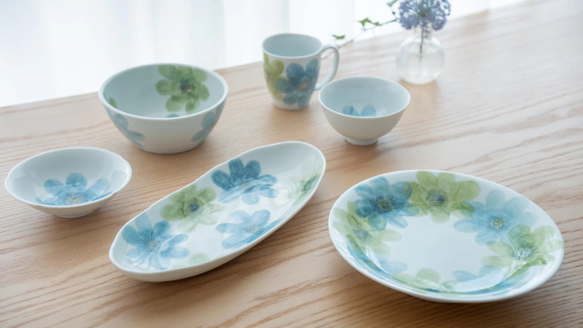 The Light Fleur Series showcases plates and bowls adorned with large-petaled flowers in calming green and blue hues. The flowers, bearing the delicate texture of Japanese washi paper, bring a tactile dimension that enhances their visual charm. The artistry of creator Ohigashi Alyne truly shines in this series, making it a delightful addition to any table setting.