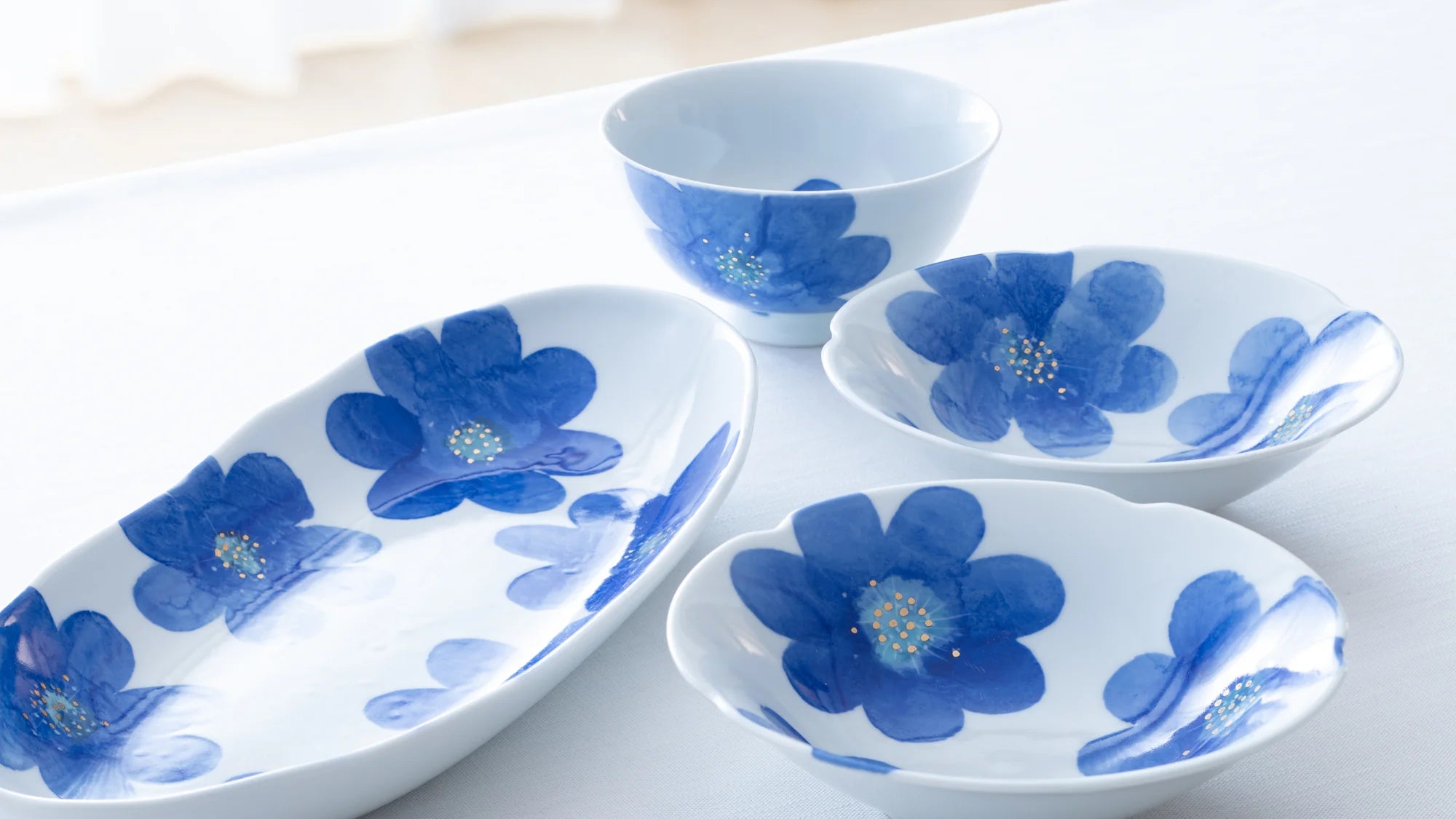 Blue flowers on a white porcelain canvas bring out a nostalgic atmosphere. Dots colored with gold are applied sporadically in the center of the flowers, creating a touch of splendor as well. The paintings are created using Alyne’s take on the technique of Japanese paper dyeing, or washi-zome, and the design reflects her unique perspective of the world, inspired by her love of nature. The warmth of the porcelain will bring a sense of comfort and joy to your dining table.