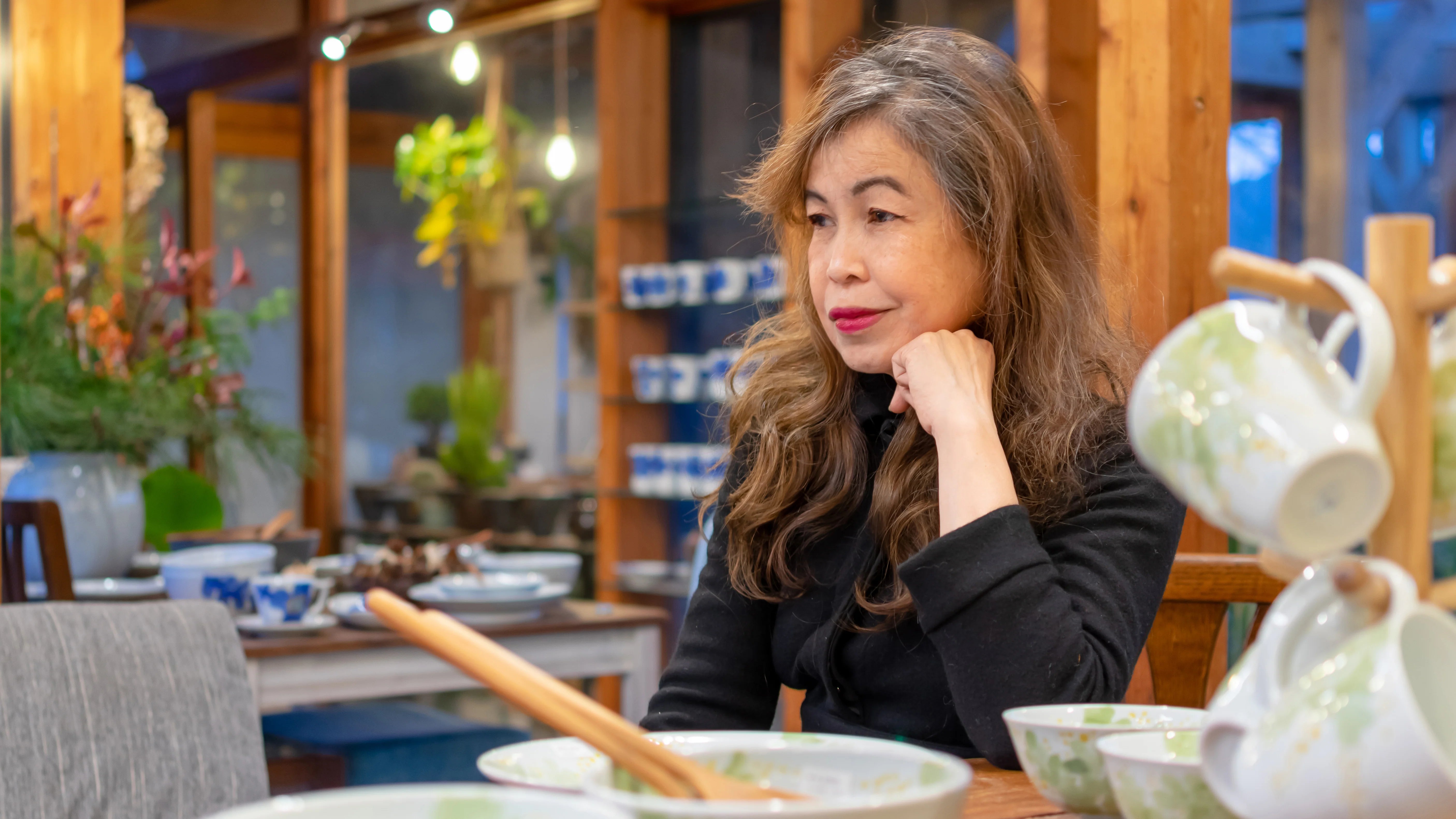 Ohigashi Alyne is an award-winning ceramics painter. Born in the Philippines, she came to Japan after meeting her husband, who had been visiting the Philippines to teach pottery techniques at a college. That brought her to the family business, Higashi Kiln, located in Isobe-cho, Ehime Prefecture. Set atop a small hill in the peaceful mountains of the Seto Inland Sea, Alyne paints beautiful designs inspired by nature surrounding her. She expresses her thoughts and feelings in her work using her own unique techniques. With the beautiful designs she paints, her works enrich people's lives, embodying her wishes that those who use her tableware will be happier and have more togetherness than ever before.