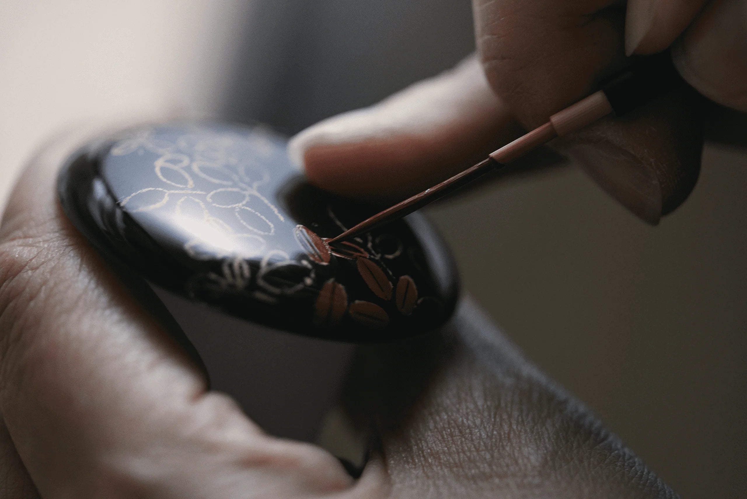 Yamanaka lacquerware is made by a division of labor among craftspeople, starting with the kiji-shi (woodworkers). In addition, there are shitaji-shi (base crafters) who make the base of the lacquerware, nuri-shi (lacquerers) who apply and finish the lacquer, and maki-e-shi (maki-e lacquerers) who do the maki-e.