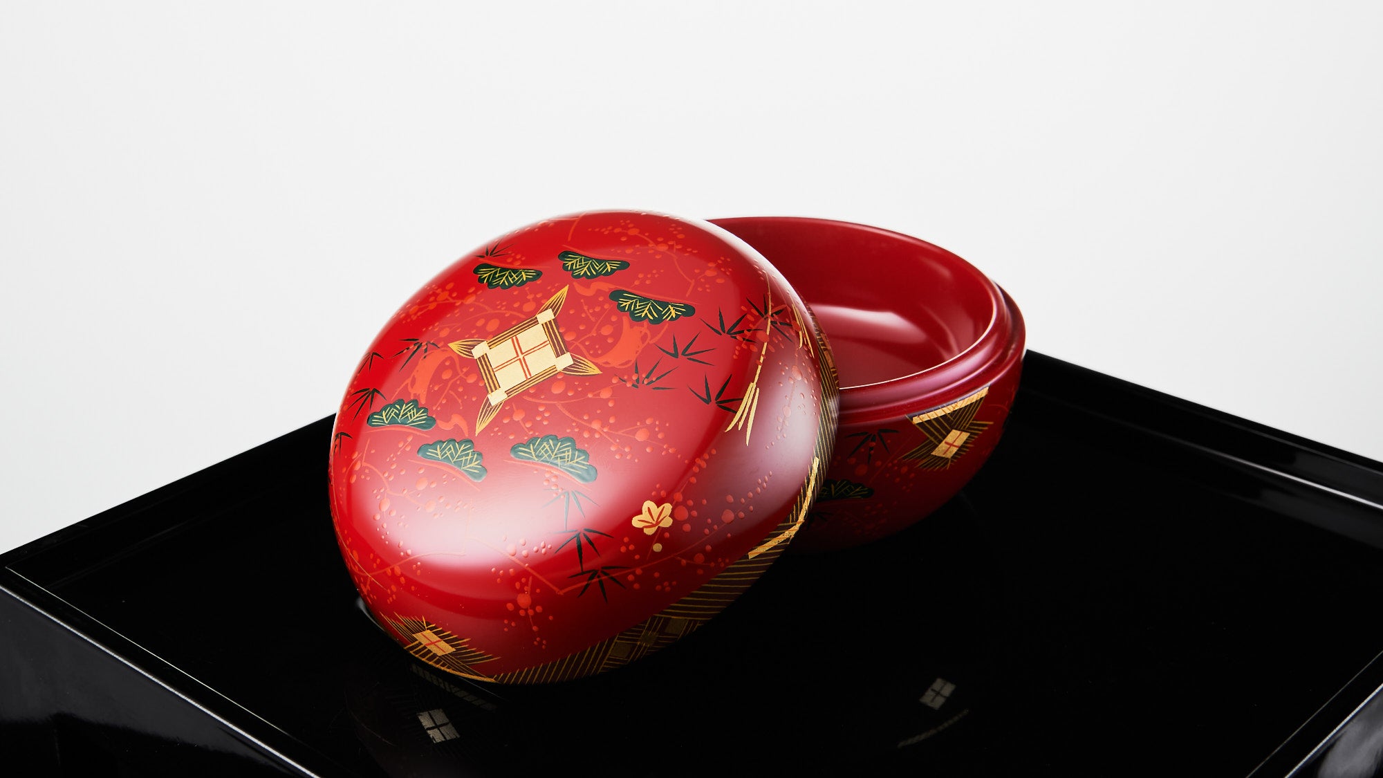 Komatsu’s work continues the lineage of Aizu-e, the full-surface lacquer painting practice that marries disciplined form with expressive freedom. In his hands, branches unfurl with measured harmony, adapting seamlessly to the vessel’s shape as if grown there by nature’s own design. Drawing upon patterns from the late Edo period (1603–1868 CE), Komatsu carries forward their refined beauty with reverence, preserving the spirit of heritage in every line and detail. Through them, the ancient art of urushi and gold endures not as a relic, but as a living language of integrity, and the deliberate beauty of things made by hand.
