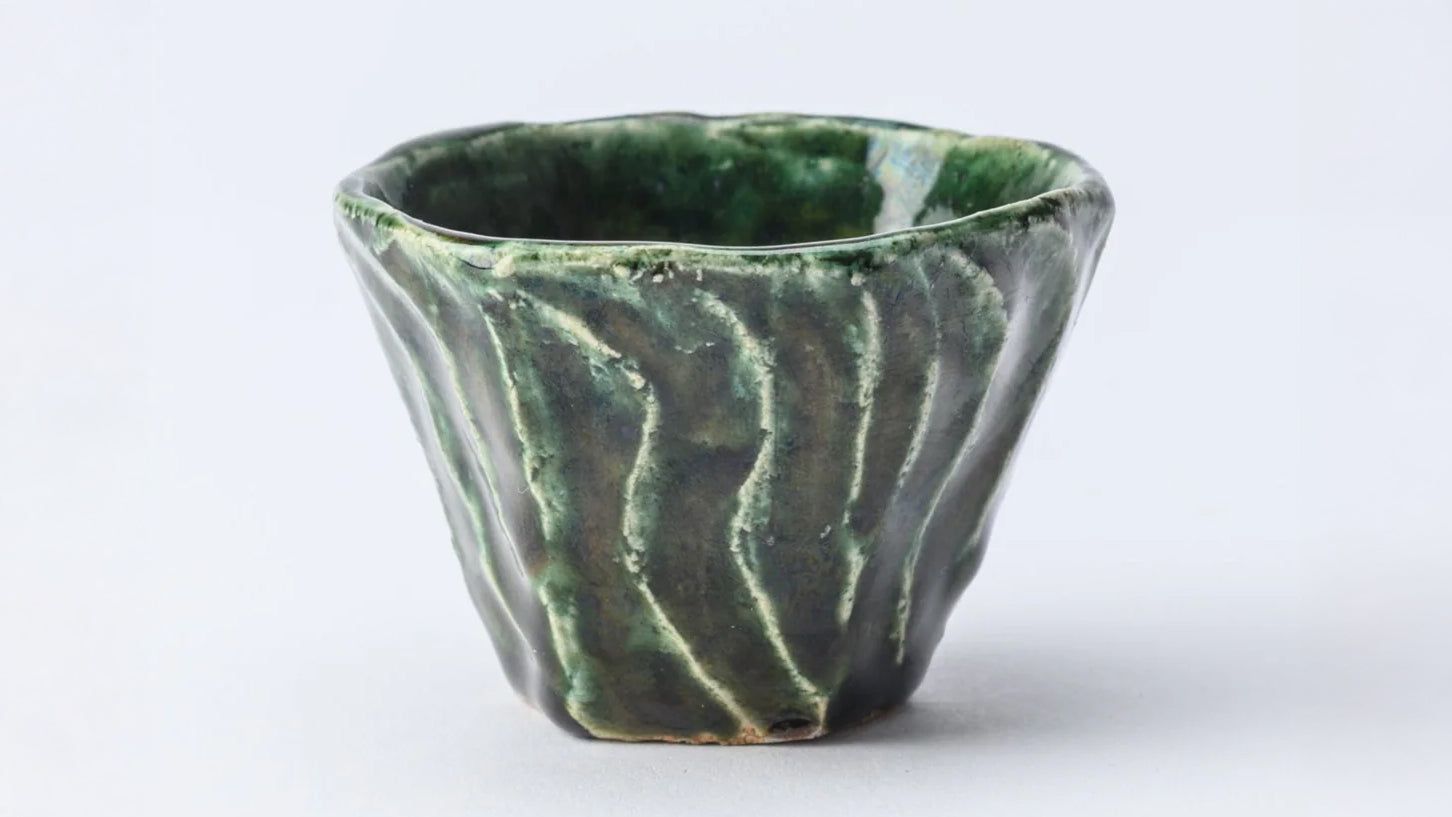 Oribe-Keramik wurde unter der Leitung von Furuta Oribe entwickelt, einem berühmten Teemeister und Samurai, der Sen no Rikyu nachfolgte. Es wird für seine kühne und unkonventionelle Ästhetik gefeiert, die in ihren innovativen Formen den Geist des Wabi Sabi widerspiegelt.
