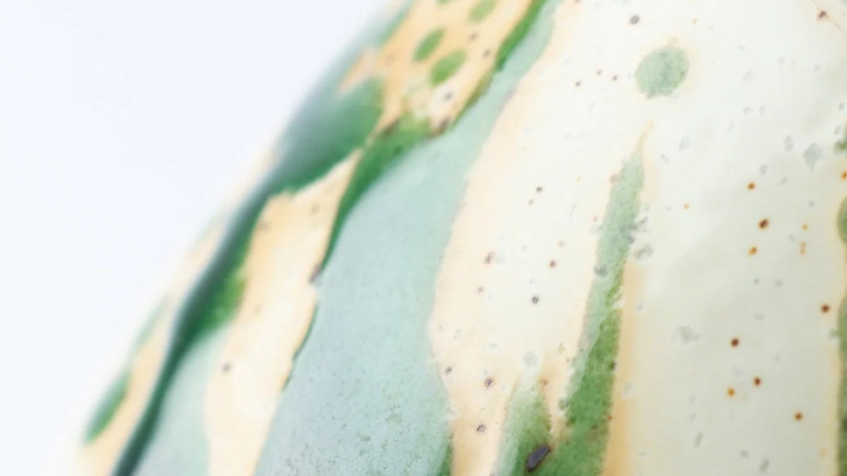 Das Markenzeichen von Oribe-Geschirr ist seine tiefgrüne Glasur, die als Oribe-Glasur bekannt ist und ein rustikales, erdiges Gefühl ausstrahlt. Diese auffällige grüne Färbung und das asymmetrische Design faszinierten Teeliebhaber der damaligen Zeit und begeistern auch heute noch Liebhaber.