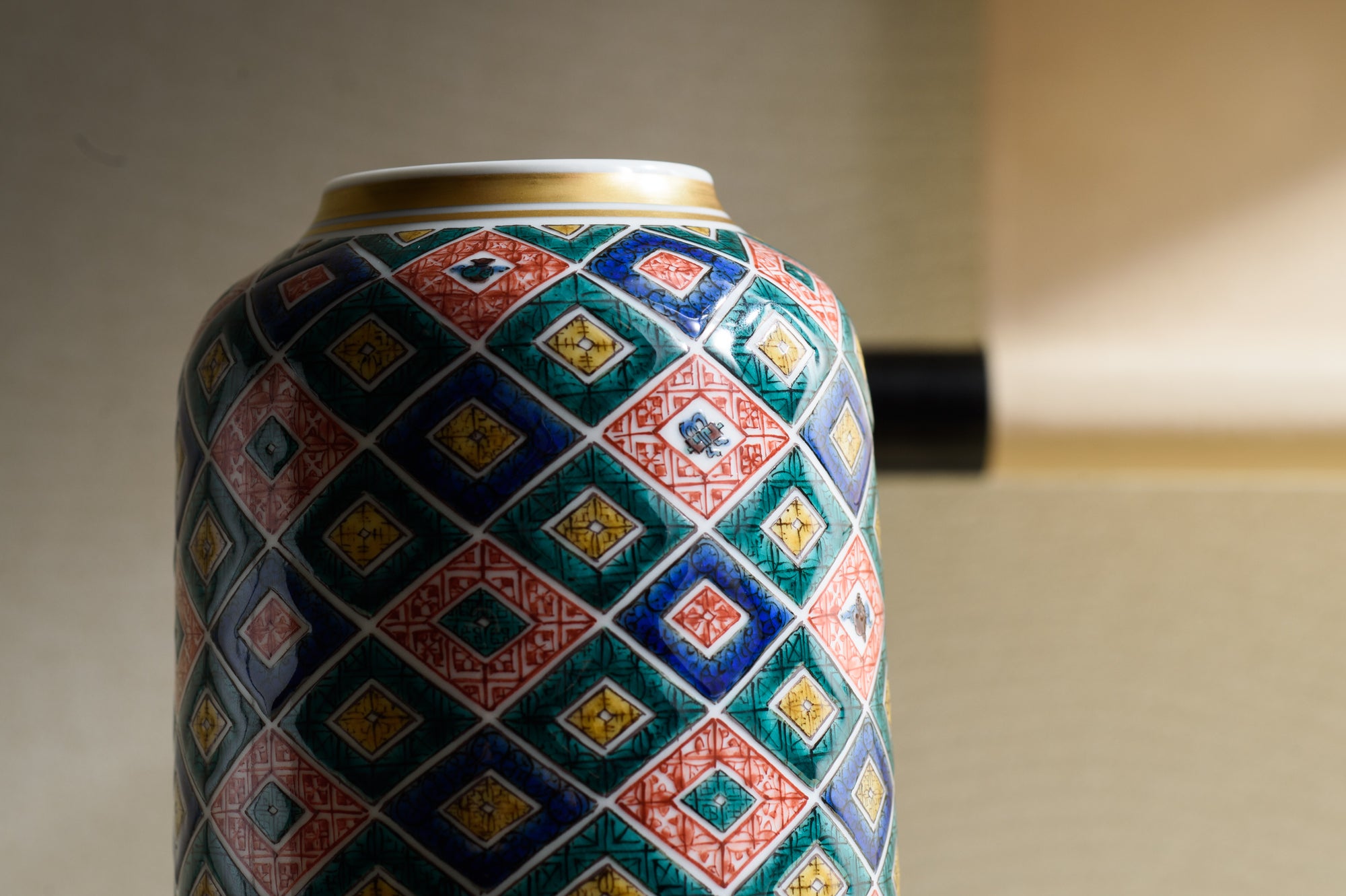 Die Kunst von Mitsui Tamekichi fängt die Tiefe und Sensibilität von Disziplin und ästhetischer Verfeinerung ein. Seine Verwendung von lebendigem Kutani gosai "Fünf Farben" und elegante, würdevolle Ausdrücke erwecken die anspruchsvolle Kunstfertigkeit natürlicher Motive zum Leben. Durch die Umarmung ko-Kutani, oder altes Kutani, Stile und Perfektionierungstechniken, die über die Jahrhunderte weitergegeben wurden, seine Kreationen ernten Bewunderung für die dauerhafte klassische Schönheit der polychromen Kunstfertigkeit der Kutani-Ware.