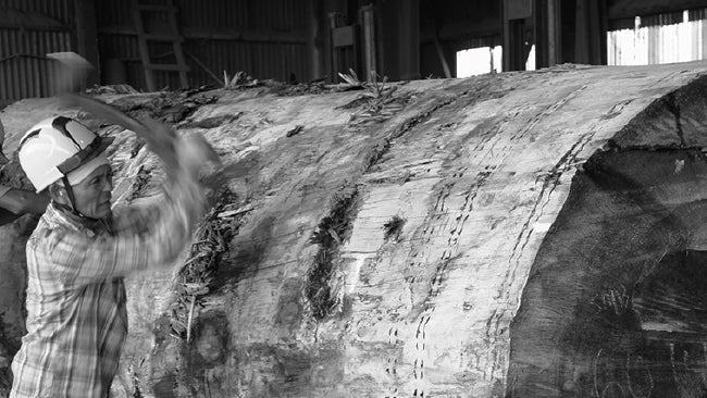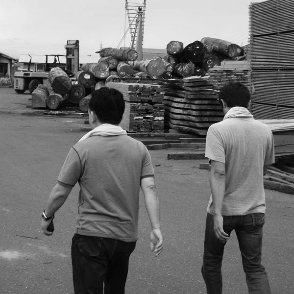 Sie besprechen mit erfahrenen Handwerkern, wie sie das Holz optimal nutzen können, achten sorgfältig auf die Richtung der Maserung und entscheiden, wie das Holz je nach dem herzustellenden Produkt geschnitten werden soll. Der Hersteller Miyabi Urushi Kogei ist beim Schneiden des Holzes immer anwesend und die Handwerker schneiden das Holz mit einer speziellen Großsäge von Hand zu einem schönen Material.