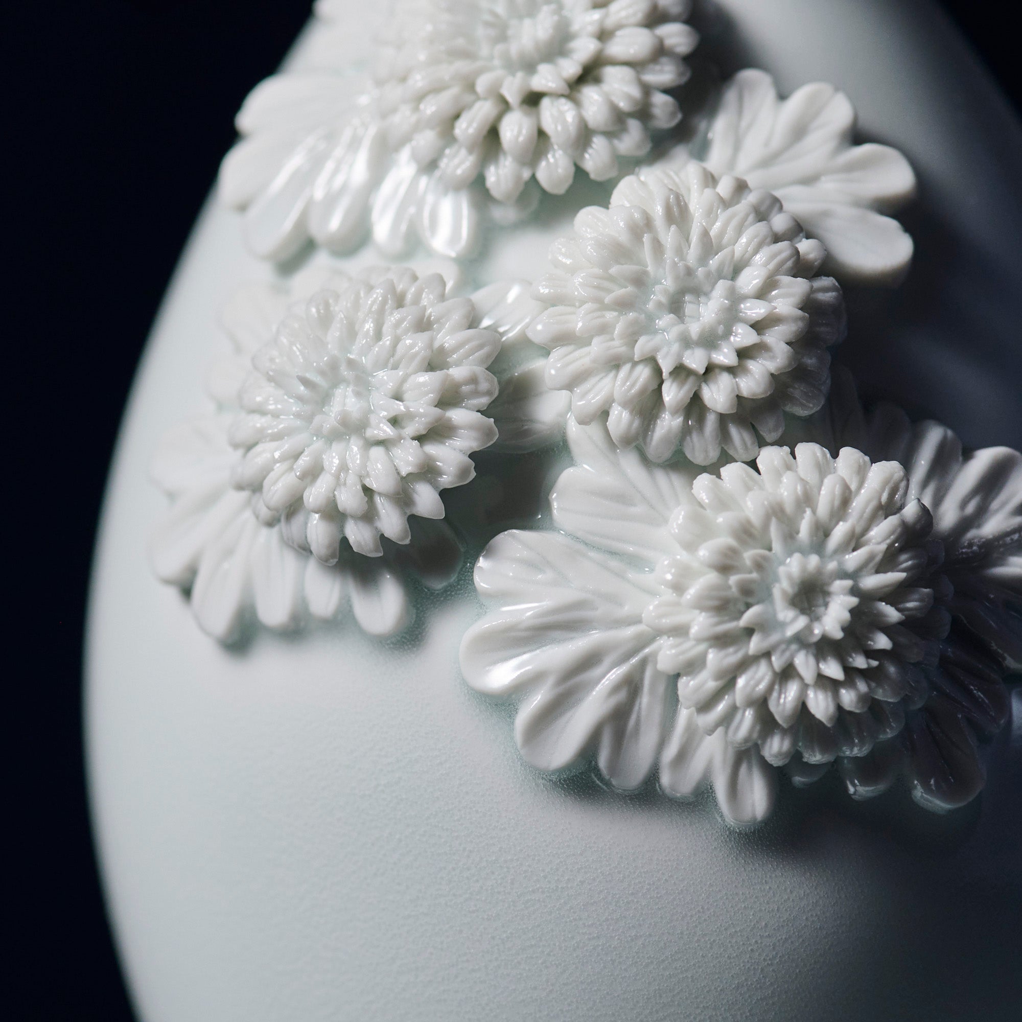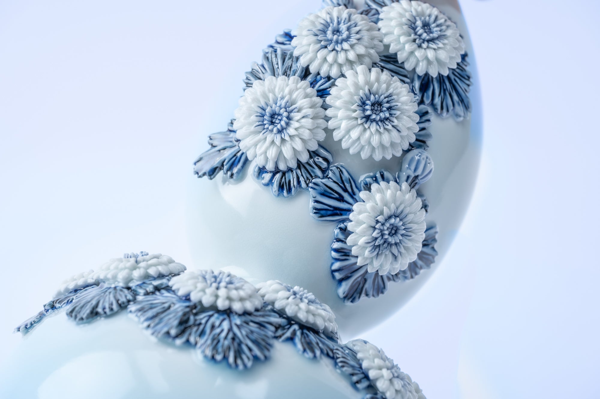 Unter Nakazatos geschickten Händen erblüht die scheinbar einfache weiße Porzellanoberfläche allmählich mit dreidimensionaler Vitalität, als würden echte Blütenblätter anmutig im Wind flattern.