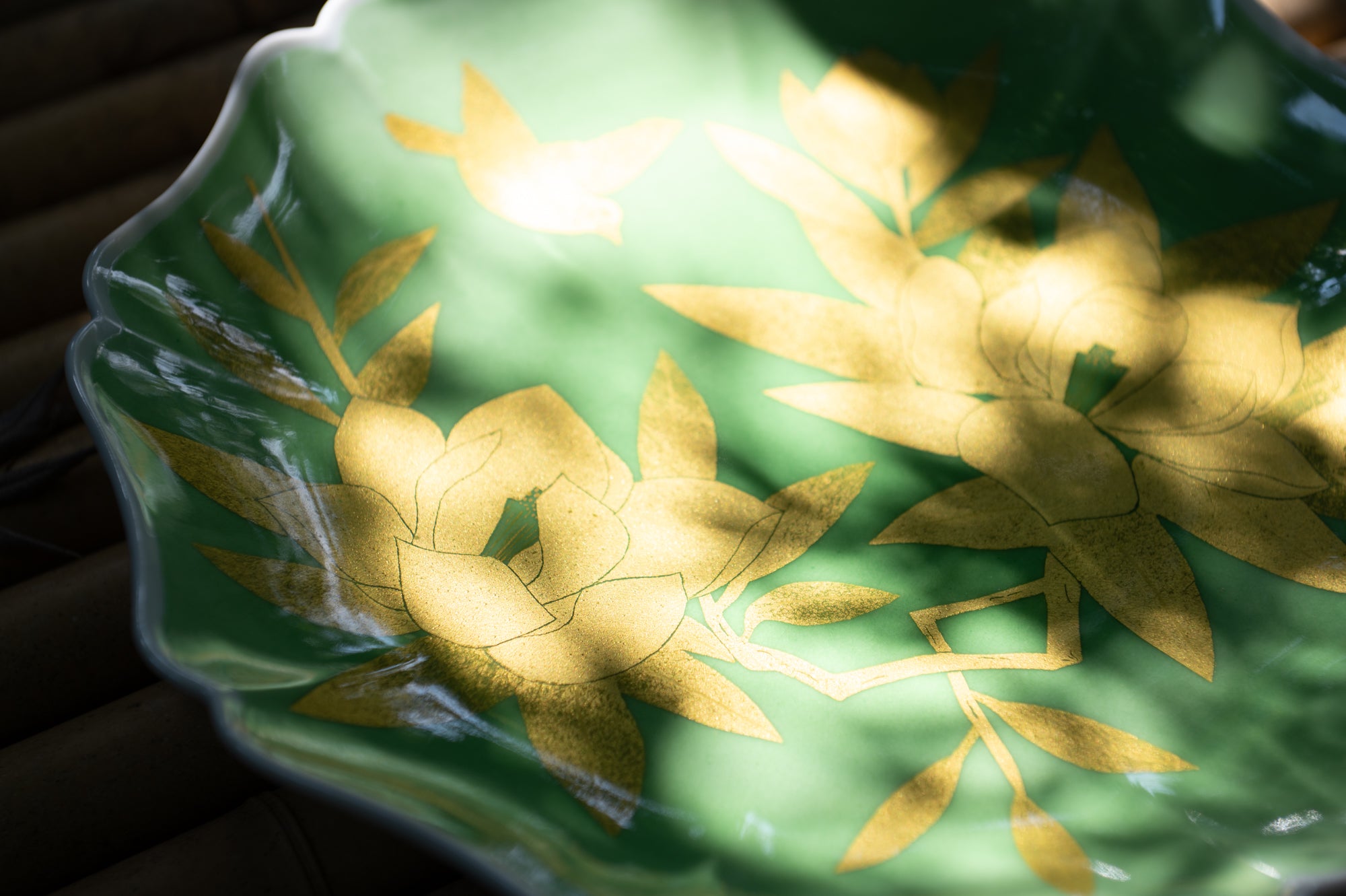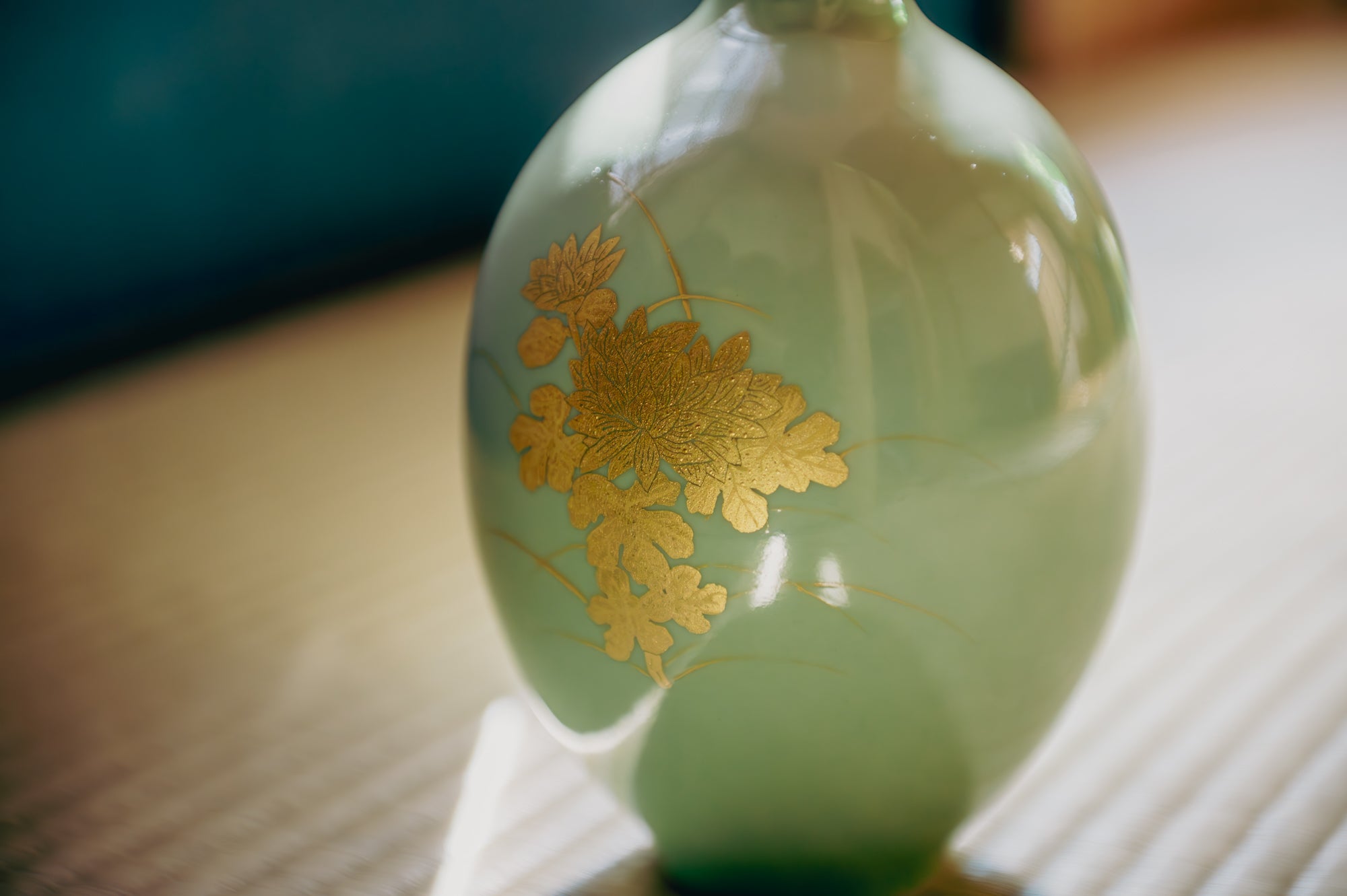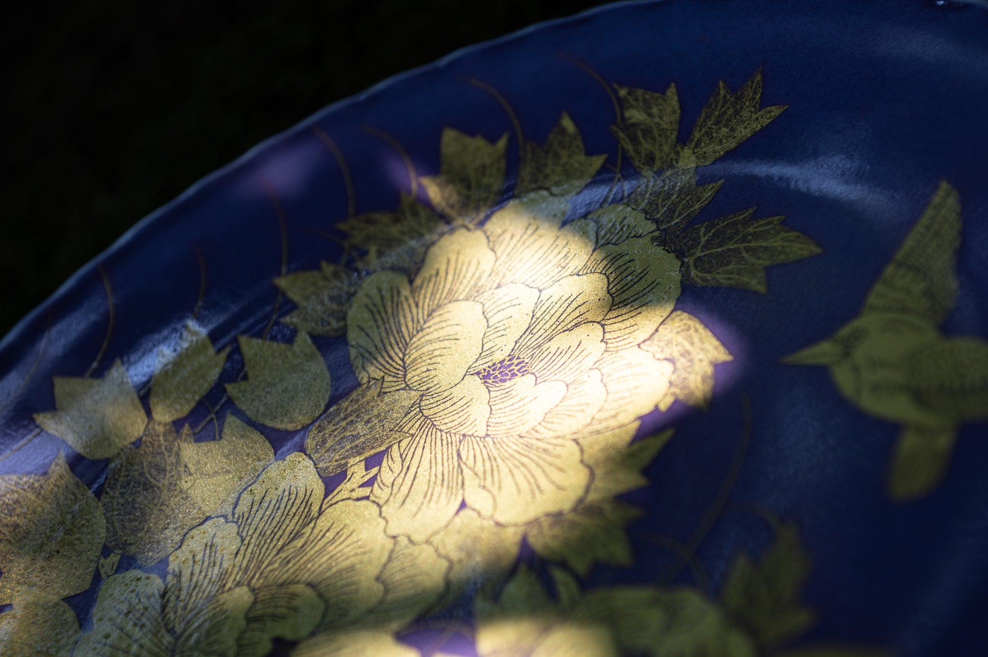 Yoshita Minori hat der Kunst neue Dimensionen verliehen Yuri Kinsai, oder „Unterglasur-Blattgold“, indem er Blattgold präzise in verschiedene traditionelle Muster und Designs schneidet. Sein einzigartiger Ansatz für Unterglasur-Blattgold besteht darin, Motive aus der Natur wie Blumen und Schmetterlinge zu verwenden und damit von den traditionelleren geometrischen Mustern abzuweichen. Die unterschiedlichen Dicken des Blattgoldes fangen die nuancierten Töne und Schattierungen der Blumendesigns ein.