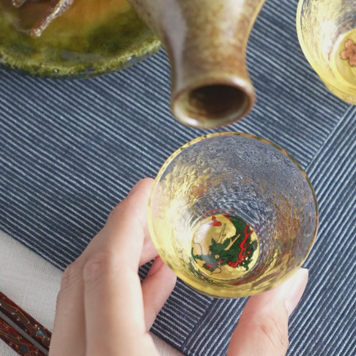 Das Glas guinomi Der mit transparentem Lack beschichtete Sake-Becher präsentiert eine ungleichmäßig gebürstete Schicht. Diese Technik erzeugt eine üppige und abwechslungsreiche Reflexion, die dem grünen Drachenmotiv am Boden Tiefe und Bewegung verleiht. Der handgemalte Drache am Boden, geschützt durch eine Glasschicht, ermöglicht es Ihnen, sein Design ohne Kratzer zu bewundern.