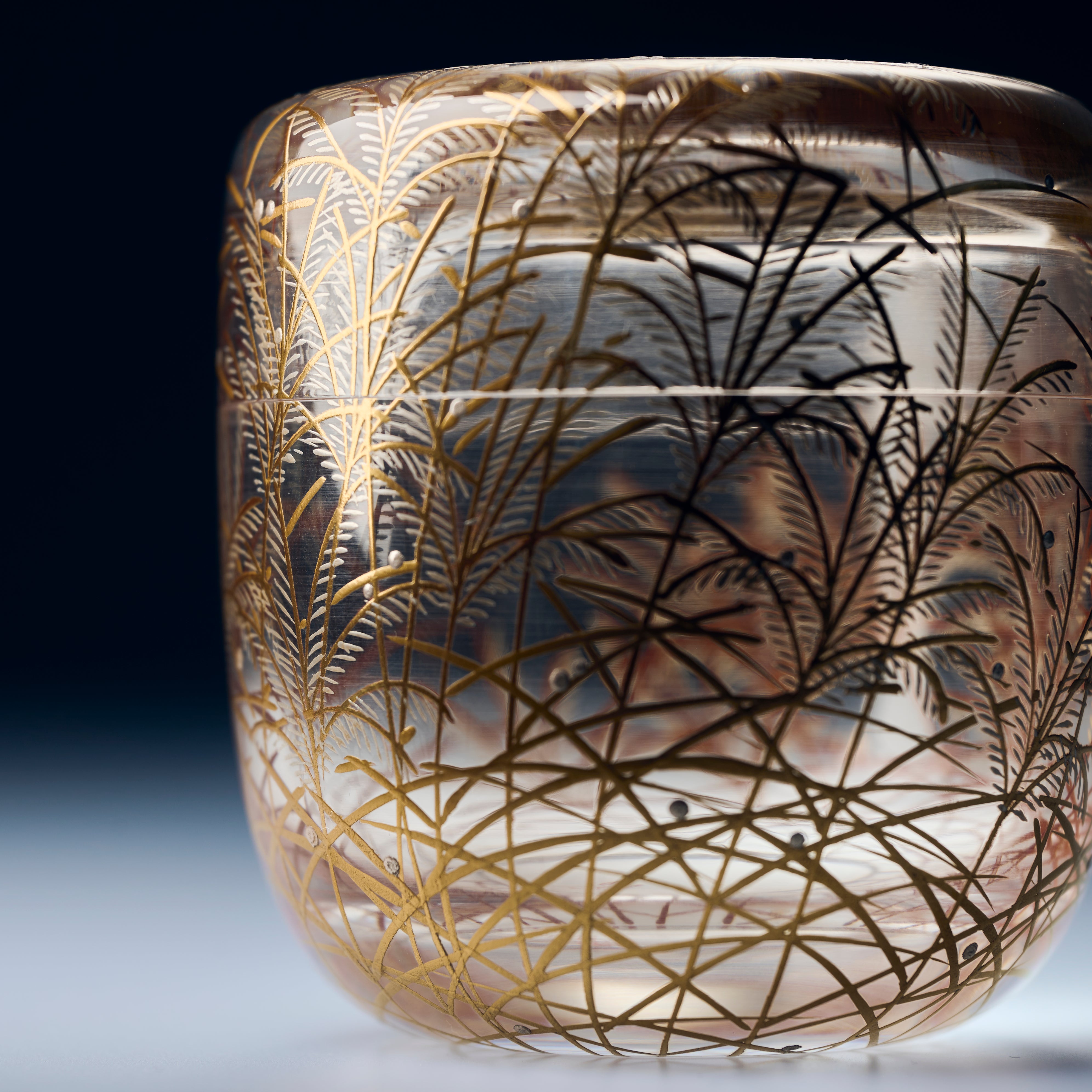 For example, Silver Grass under the Moon Natsume Matcha Container. From the outside, a silver moon appears to float in the night sky, but when seen from the underside of the lid, a golden moon emerges. On the pampas grass, specks of silver powder evoke the sparkle of morning dew, creating a dimensional and dreamlike atmosphere. Speaking of this work, Hariya notes that he sought to capture “a fantastical mood, as if the moon were shimmering in the middle of the night.”