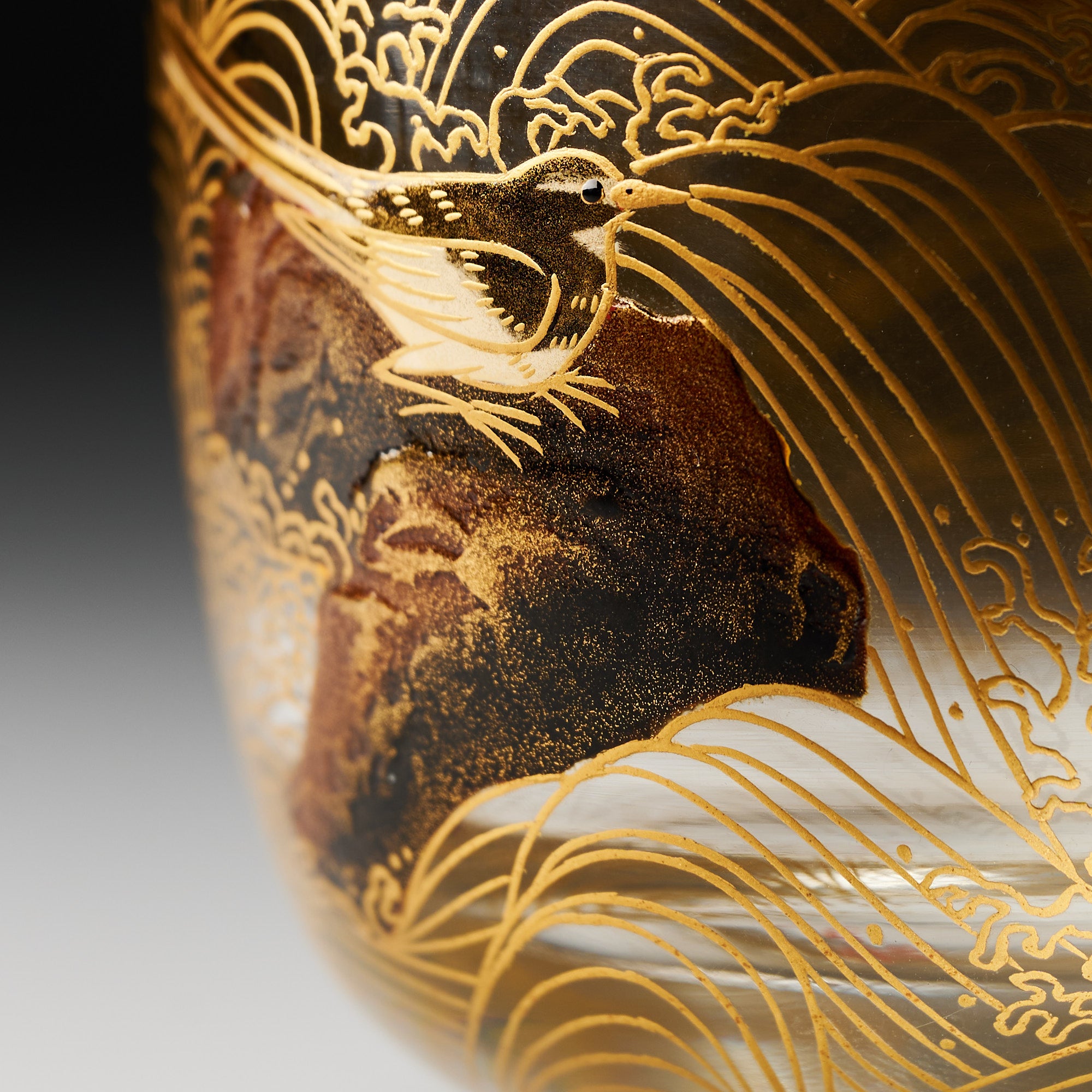 Another piece, Wagtails at the Waterfall Natsume Matcha Container, conveys a similar duality. It depicts a summer landscape of Japan, where a waterfall cascades between verdant maple leaves, evoking a sense of coolness and clarity. Viewed from the outside, the scene is rendered in deep, natural tones, while the inner side of the lid bursts into vivid colors, as if illuminated by light itself.