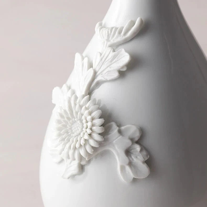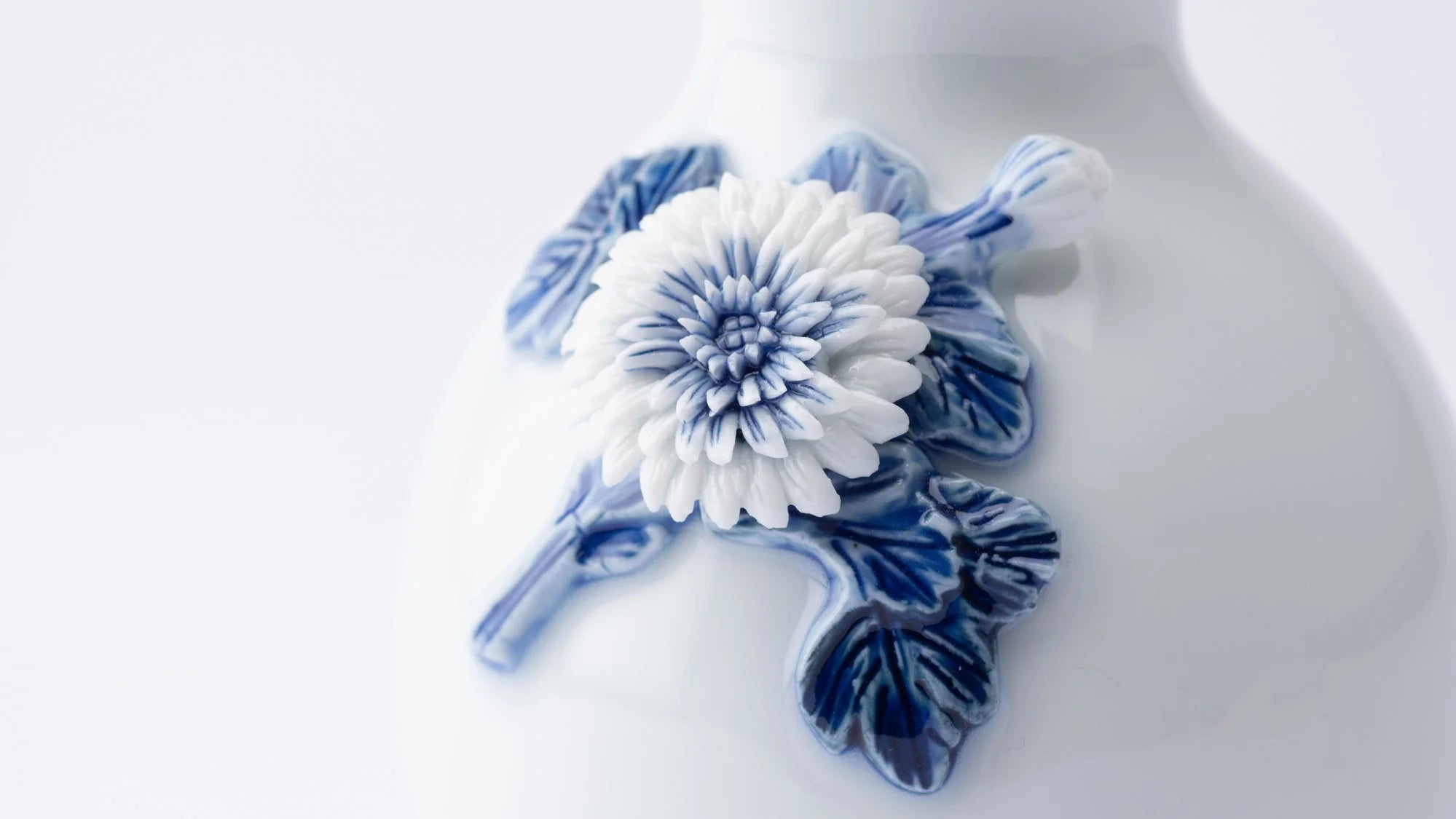 Las flores de crisantemo talladas a mano, elaboradas individualmente, se colocan en jarrones y tapas como decoración. Estas flores de crisantemo están hechas de porcelana, el mismo material que el cuerpo del recipiente, lo que las convierte en parte integral del mismo.