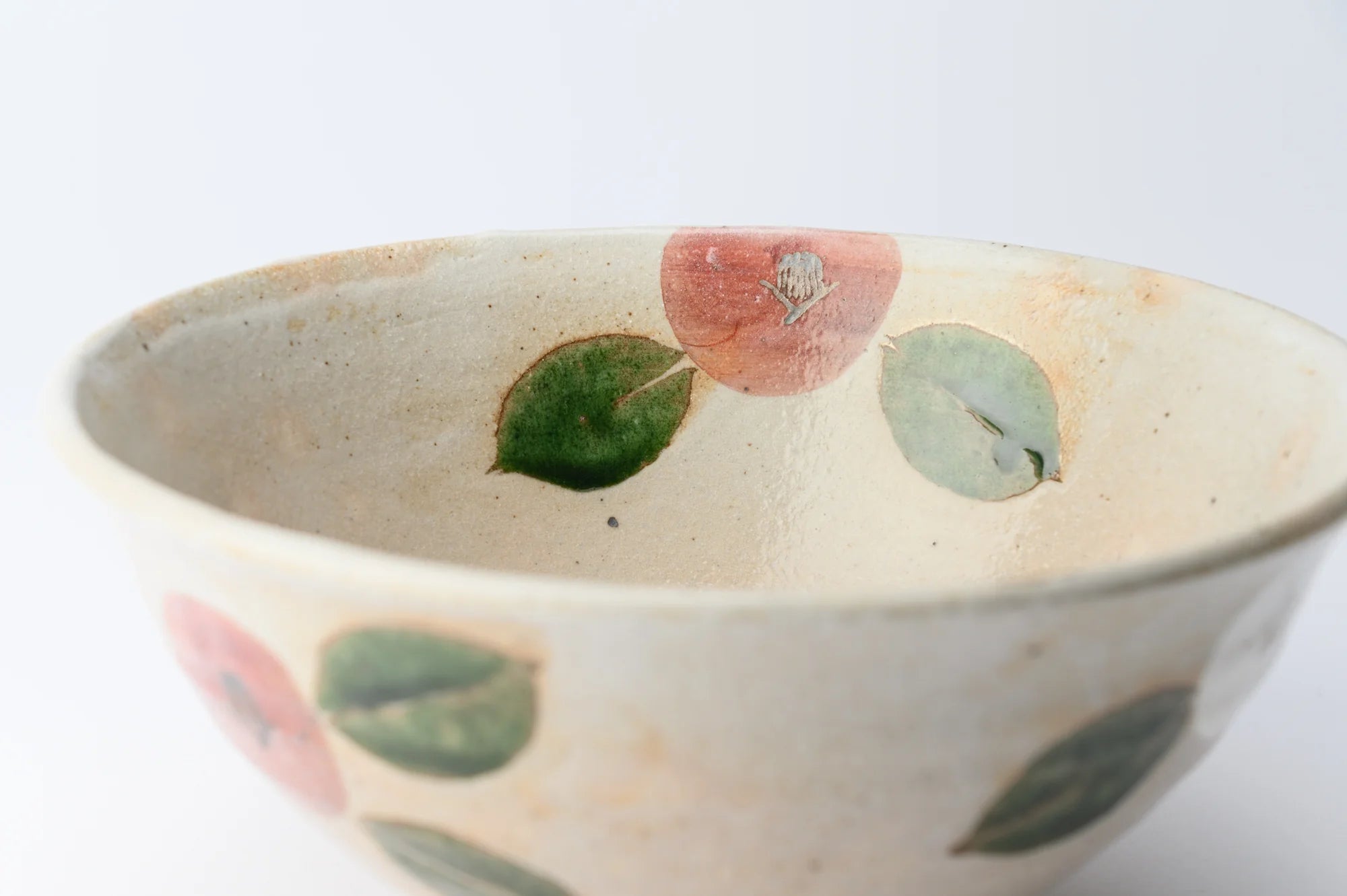 El motivo de la camelia, un diseño tradicional transmitido de generación en generación, es reinterpretado por Tsujii Musashi con un toque distintivo y delicado. En lugar de representar cada pétalo con detalle, utiliza pinceladas suaves y redondeadas para capturar la esencia de la forma de la camelia. Este enfoque realza el encanto natural y la serena belleza de la flor, aportando una cualidad encantadora y genuina al diseño.