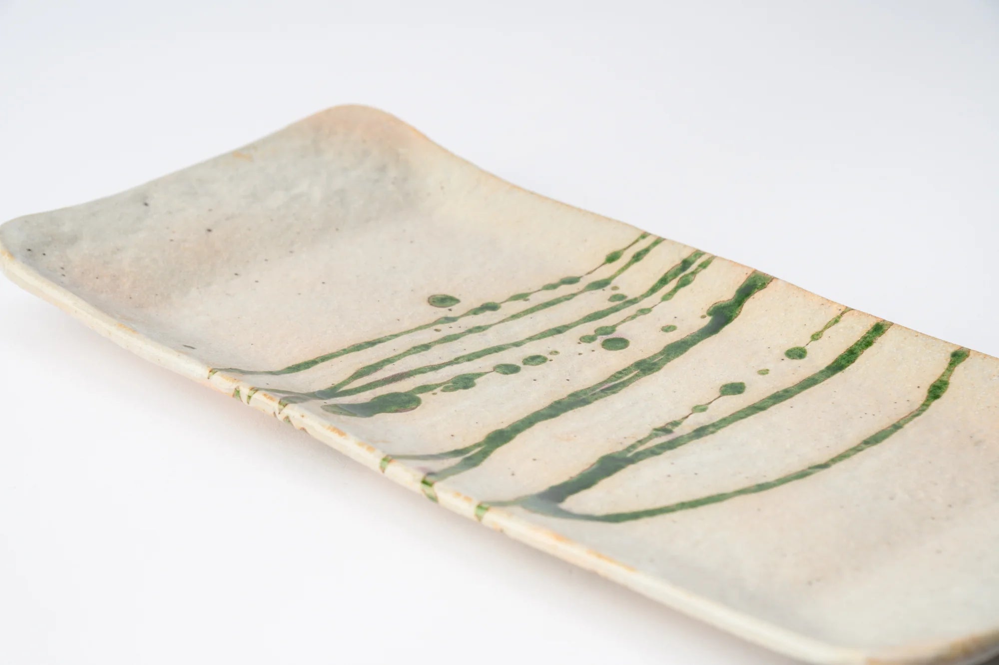 El motivo de plantas acuáticas es un sello distintivo de la cerámica Yashichida Oribe, creada por Yashichida Kiln, empresa activa principalmente durante la era Kanei (1624-1644 d. C.). Caracterizado por el esmaltado verde y la pincelada abstracta, este diseño expresa no solo el color, sino también el delicado movimiento de las plantas acuáticas meciéndose con la corriente. El uso del esmaltado verde natural y las pinceladas fluidas evoca la elegancia y el suave ritmo de la vida acuática, aportando una sensación de vitalidad y calma a cada pieza.