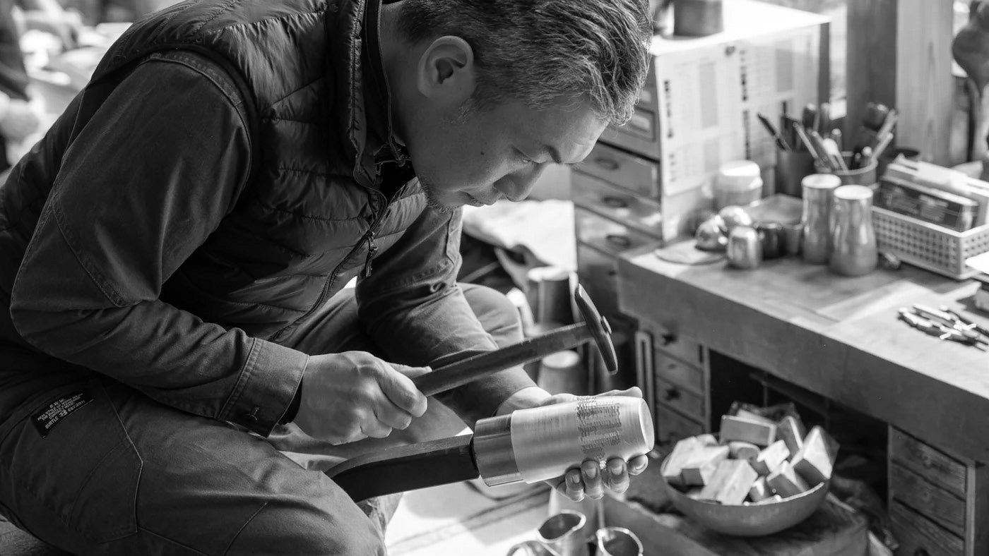 Niigata Prefecture is home to a 300-year-old Japanese craft known as tsuiki copperware, in which a single sheet of metal is skillfully hammered and shaped using various types of hammers to create products such as tea and sake utensils. Nishikata Ryota, the head of the tsuiki workshop Seigado, is the only artist in Japan currently continuing the production of mimikuchi-uchidashi yuwakashi—kettles with the body, spout, and ear-like handle attachments all hammered from a single sheet of copper.