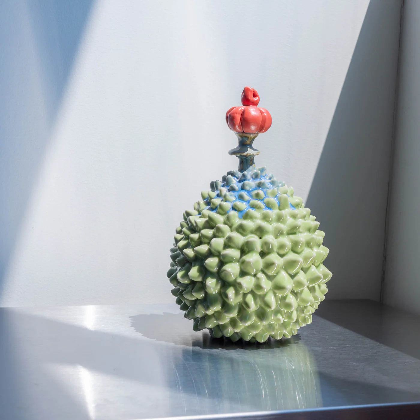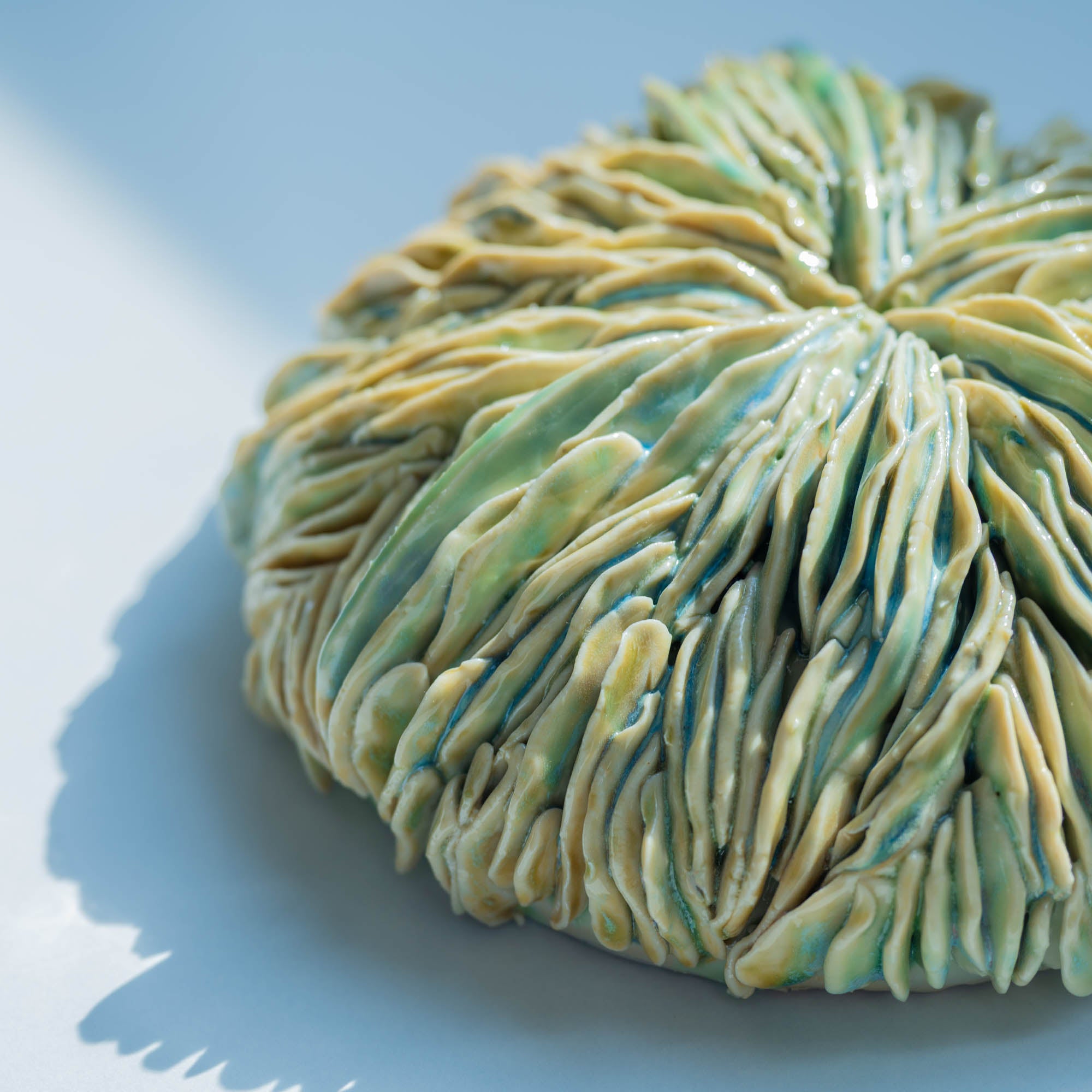 The works in Ohigashi’s Botanical Textures series are art pieces—ceramic sculptures that mark a departure from her more commercial work in tableware. Brightly colored, intricately shaped, and vividly alive, these objets d’art reside on the border between playful and serene, realistic and fantastical.