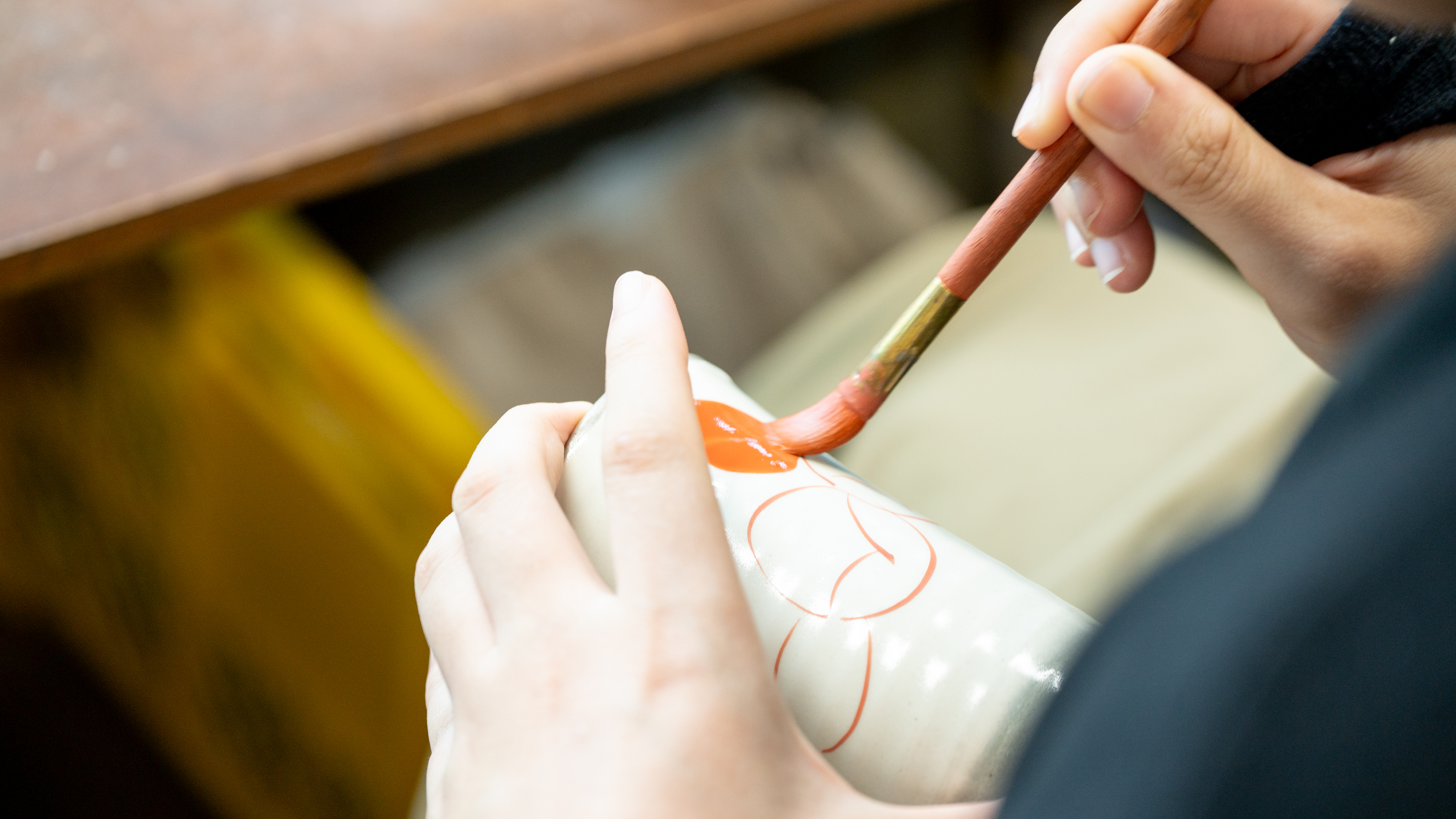 Akae, or red overglaze painting, is a decorative technique that centers on red and is accented with hues such as green, purple, and blue, creating designs rich in depth and visual layering. The motifs most commonly feature floral patterns such as chrysanthemums, as well as flowing arabesque designs. At Zoho Kiln, vessels are decorated using an original akae pigment, red enamel meticulously ground over a long period of time, resulting in pieces of exceptional depth and refinement.