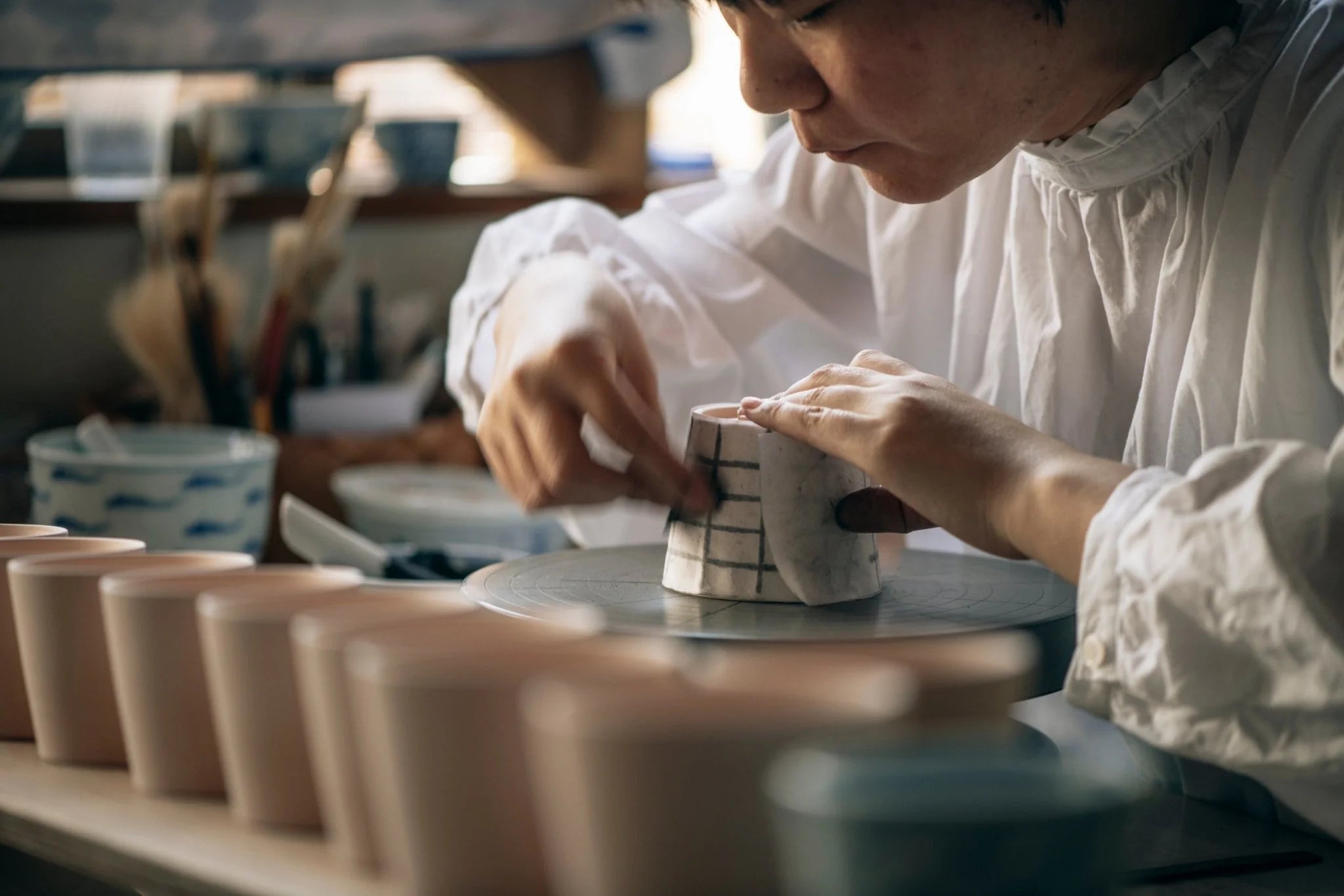 Les motifs sont peints avec une sous-glaçure bleu cobalt appelée « Gosu » . Un pinceau fin est d'abord utilisé pour tracer les lignes, puis un pinceau spécial appelé « Dami » permet d'exprimer les nuances de couleur. Ce procédé, très patient, confère aux produits du four Keizan tout leur charme.