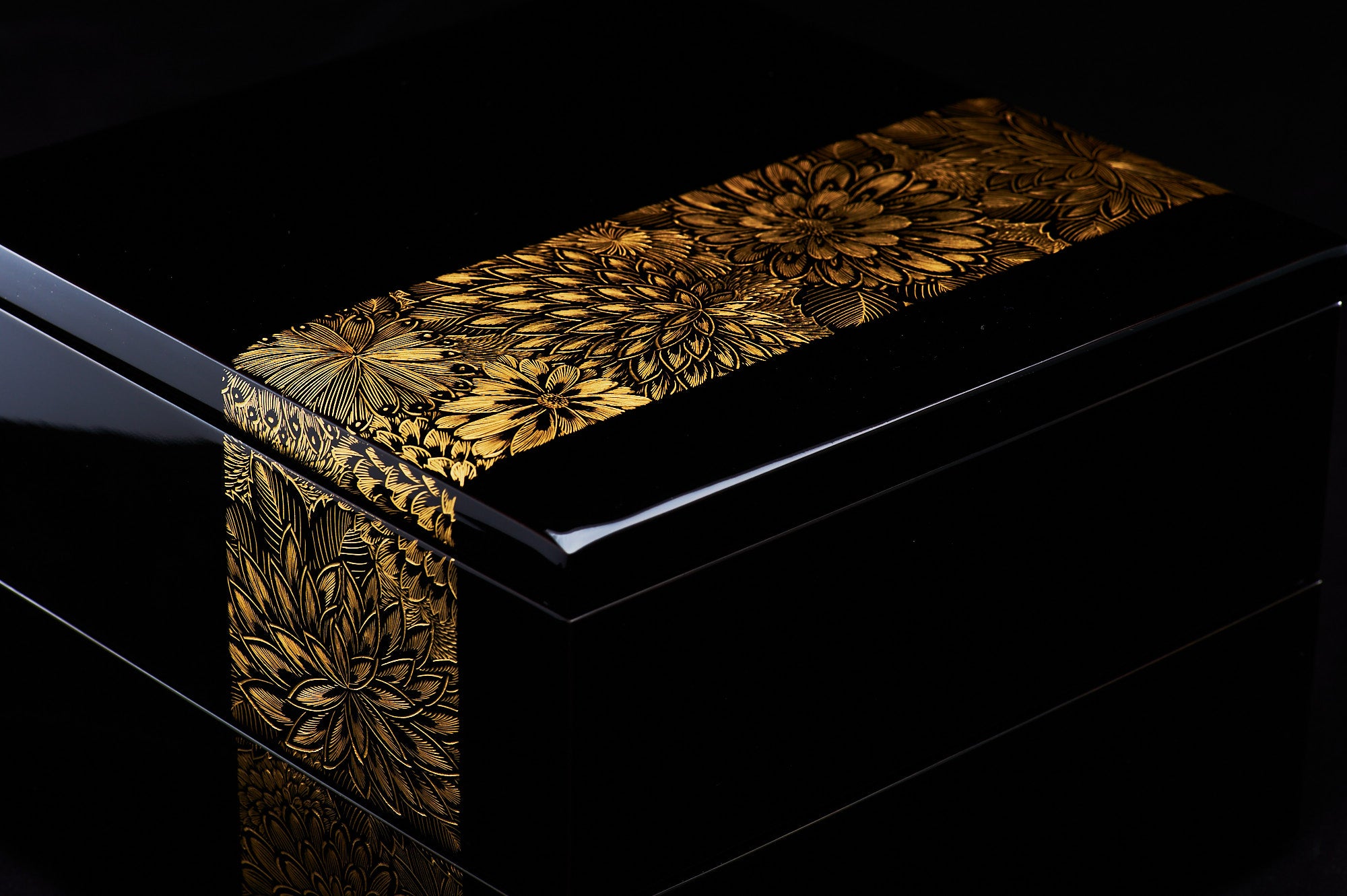 Cette technique décorative consiste à graver une surface laquée à l'aide de burins de différentes tailles et formes, un procédé exigeant précision et habileté compte tenu de la dureté de la laque. En ajustant la profondeur et l'angle de chaque gravure, Takade crée des motifs allant des plus délicats et subtils aux plus audacieux. Une fois les lignes et les points gravés, Takade applique méticuleusement de la feuille d'or et de la poudre dans les rainures. En essuyant soigneusement l'excédent, des motifs complexes aux différentes nuances d'or émergent avec une clarté époustouflante sur une laque noire profonde et polie.