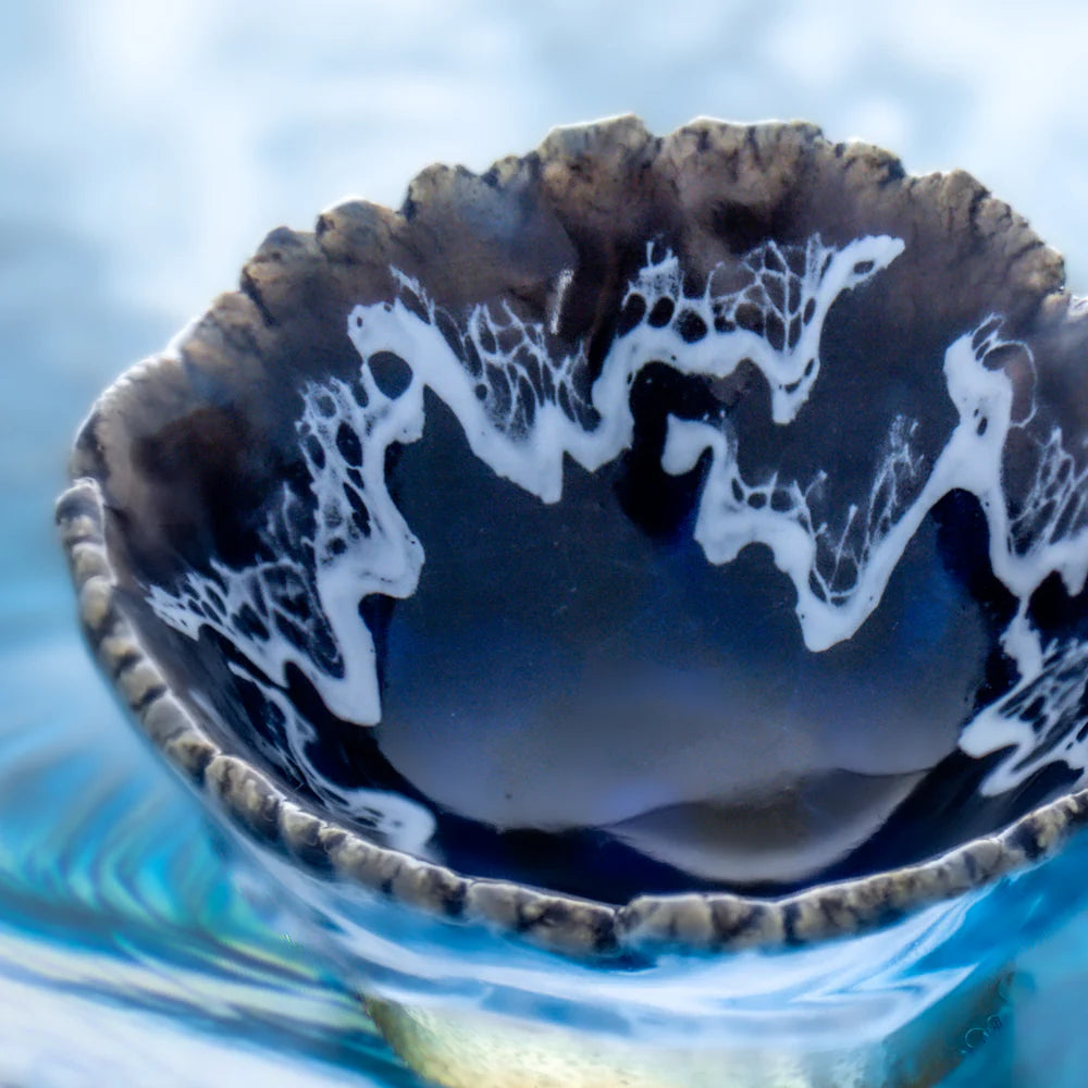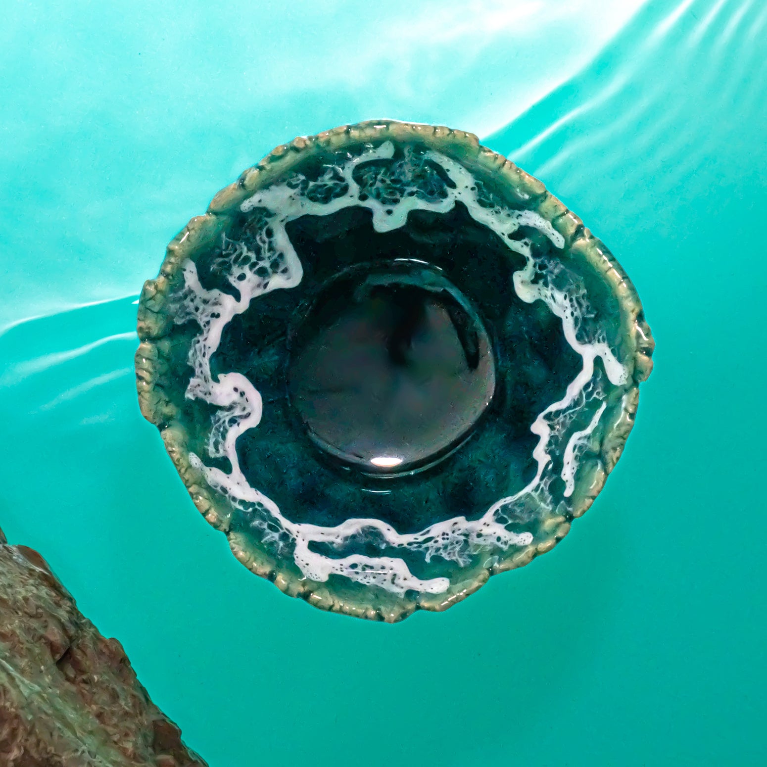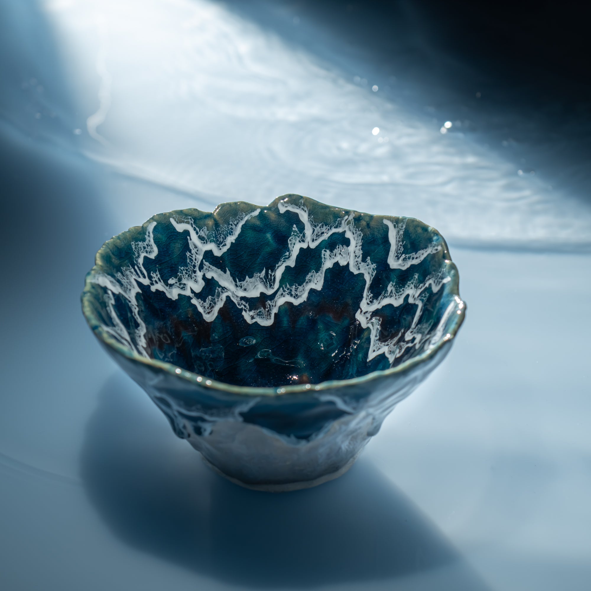 Yamaura façonne ses pièces à la main, sculptant des formes irrégulières mais équilibrées, conçues pour accueillir le mouvement des pigments. Après plusieurs cuissons, les teintes brillantes de Kutani–nuances de bleu, de vert et autres–se superposent généreusement sur les formes supérieures. Un dégradé de blanc se drape ensuite et se déploie sur les côtés, évoquant les embruns ou un relief balayé par le vent. Aucun résultat ne se ressemble. Dans le four, la surglaçure trouve sa voie, recouvrant l'argile de motifs délicats et organiques, guidés par la gravité et la chaleur. Chaque pièce est expressive et intentionnelle, rendue vivante par le contrôle précis de Yamaura sur la densité, la température et le timing du matériau.