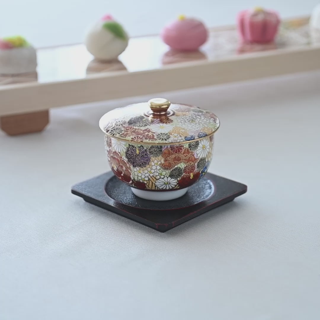 This premium handmade ceramic Japanese teapot set features the hanazume style—literally meaning “filled with flowers”—one of the most iconic designs of Kutani ware, passed down since the Taisho period (1912–1926 CE), with each piece hand-painted in vibrant colors, finished with gold accents, and subtly varied to reflect the artisan’s skill, making every set beautifully unique.