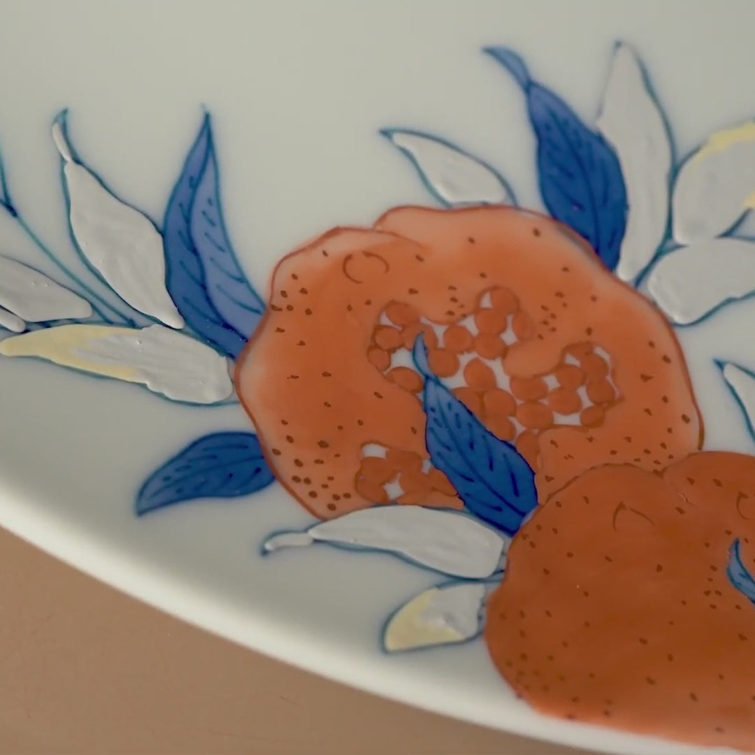 This dinner plate has a beautiful pomegranate design in the iro-Nabeshima (colored Nabeshima) style on stunning white porcelain. The pomegranate pattern is one of the most representative patterns of Nabeshima ware.