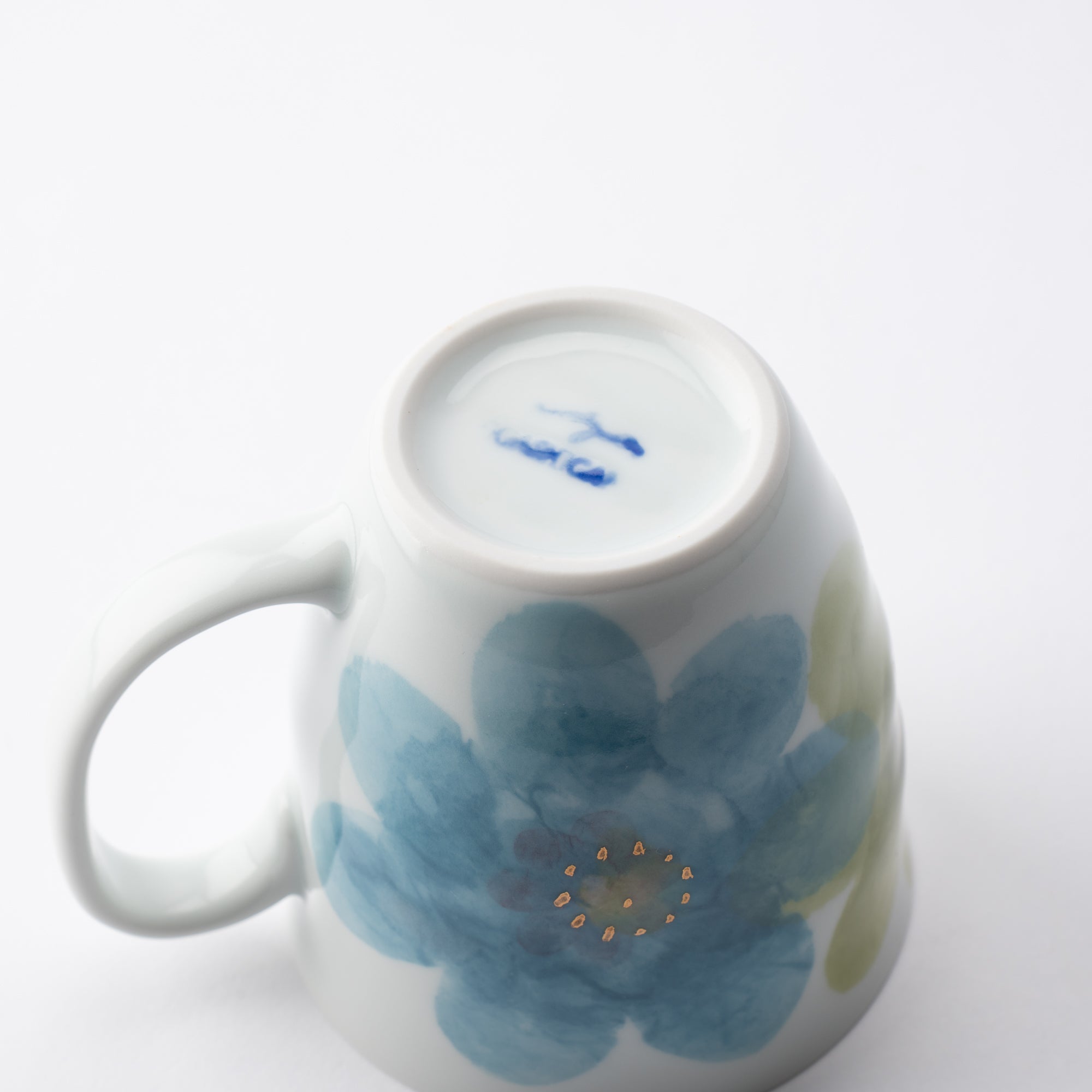 This charming Tobe ware mug features beautiful flowers in gentle hues of green and light blue.