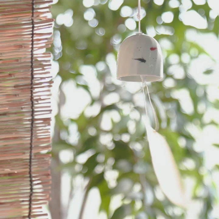 This porcelain wind chime features medaka, or Japanese rice fish, swimming gracefully across its celadon surface. As it sways, subtle diagonal carvings create the illusion of fish gliding through water. In Japan, medaka are a familiar sight in summer, their quiet presence bringing a sense of calm. Each design is meticulously hand-painted by artisans, giving the piece a lively, one-of-a-kind character.