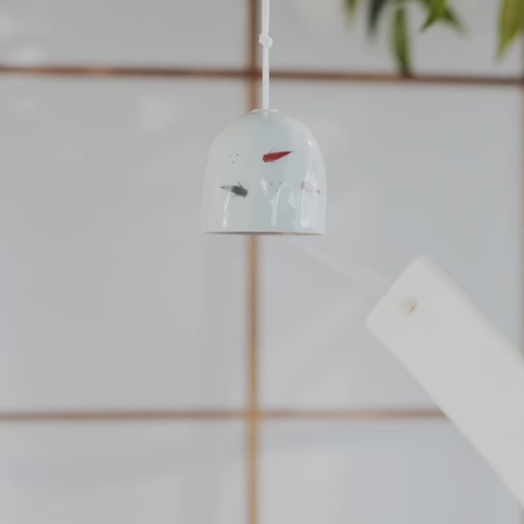 This porcelain wind chime features medaka, or Japanese rice fish, swimming gracefully across its celadon surface. As it sways, subtle diagonal carvings create the illusion of fish gliding through water. In Japan, medaka are a familiar sight in summer, their quiet presence bringing a sense of calm. Each design is meticulously hand-painted by artisans, giving the piece a lively, one-of-a-kind character.