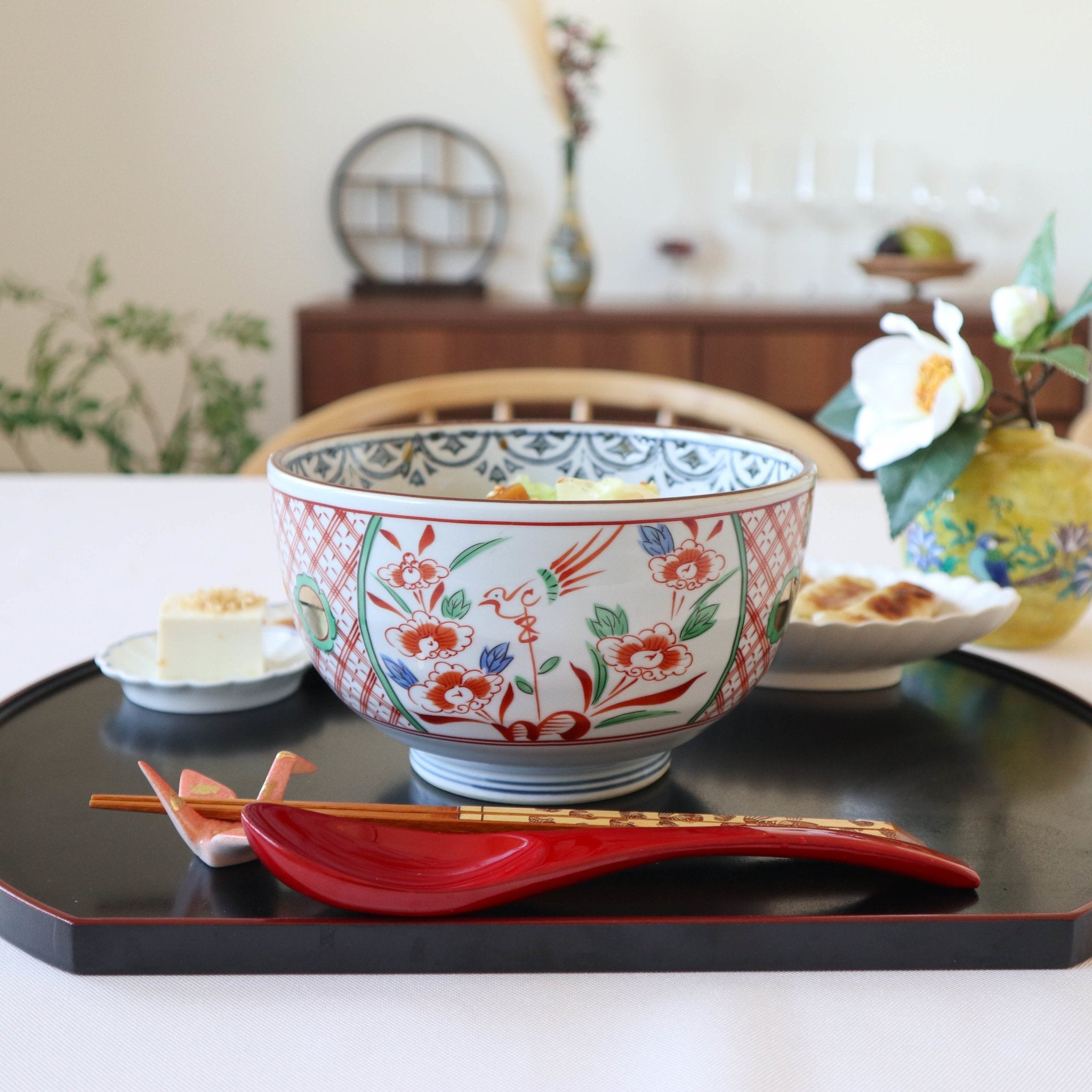 This large donburi bowl features a stunning flower garden design nestled between a lattice-like pattern. The focus on red and green against a pure white base, appears even more vibrant with the addition of blue accents and subtle gold details.