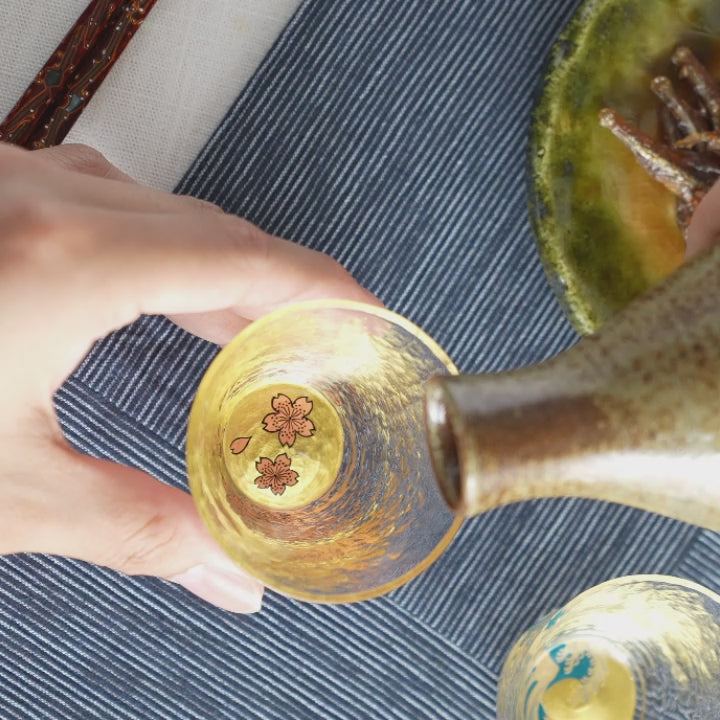 This glass guinomi sake cup, coated with transparent lacquer, boasts an uneven brushed layer that creates a lavish and varied reflection of gold, emanating from the gold leaves at the base. The hand-painted cherry blossom at the bottom, safeguarded by a glass layer, allows you to appreciate its design without the worry of scratches.