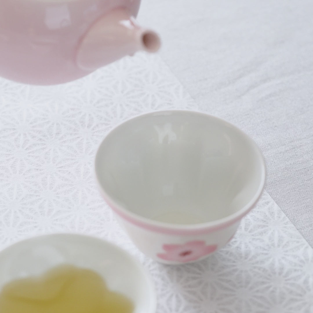 This is a lovely Arita ware teapot in a delicate sakura (cherry blossom) pink color. The lid is adorned with a three-dimensional sakura flower which is also the handle for the lid.