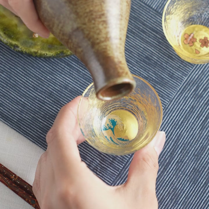 This mesmerizing crystal glass sake cup is adorned with the iconic Great Wave off Kanagawa, a famous work by Hokusai. The blue and white of the wave contrast harmoniously with the gold base, creating a stunning visual effect. With the painting protected by a layer of glass, the design can be appreciated without worrying about scratches.